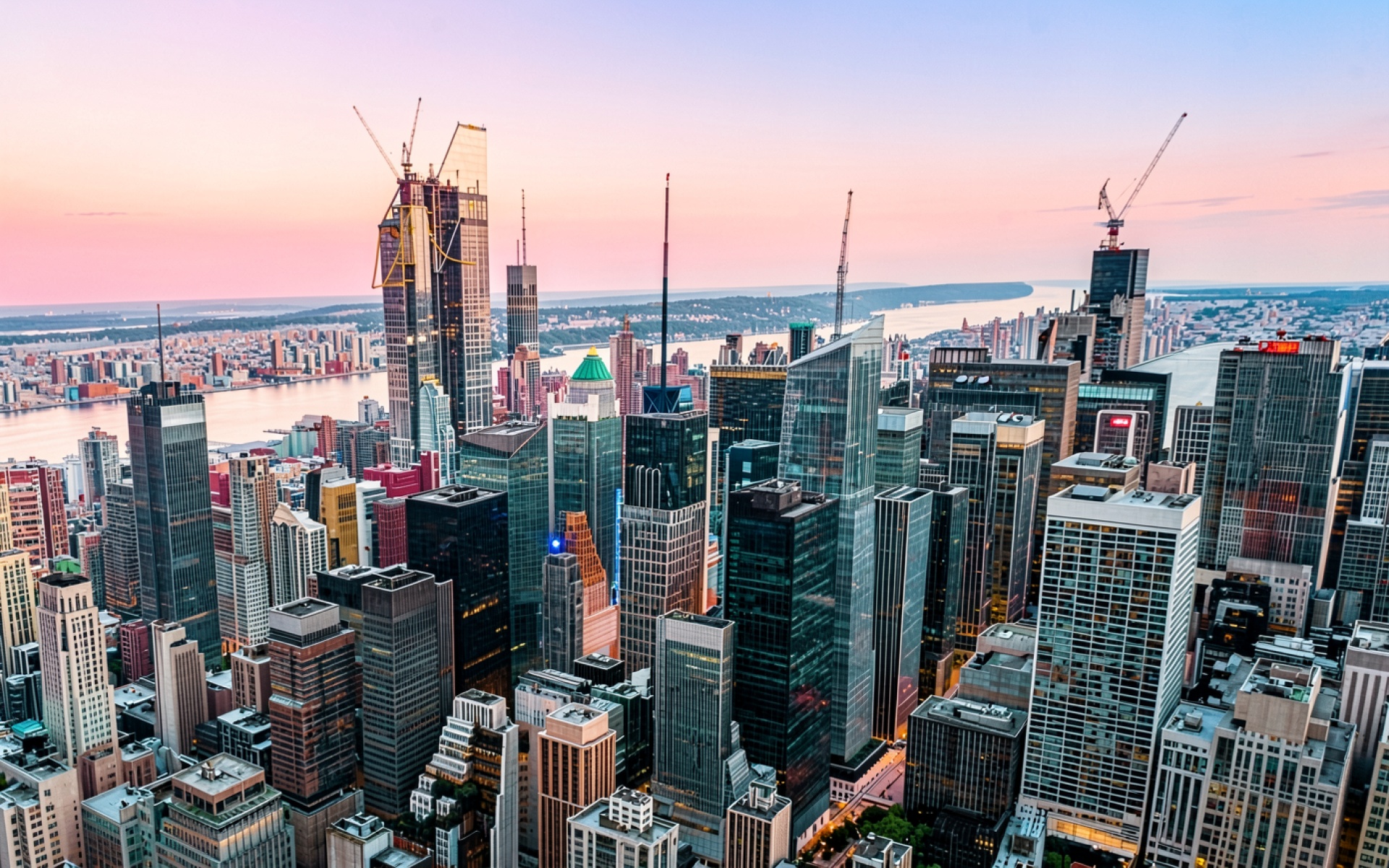Панорама небоскребов Нью-Йорка в розовых сумерках обои