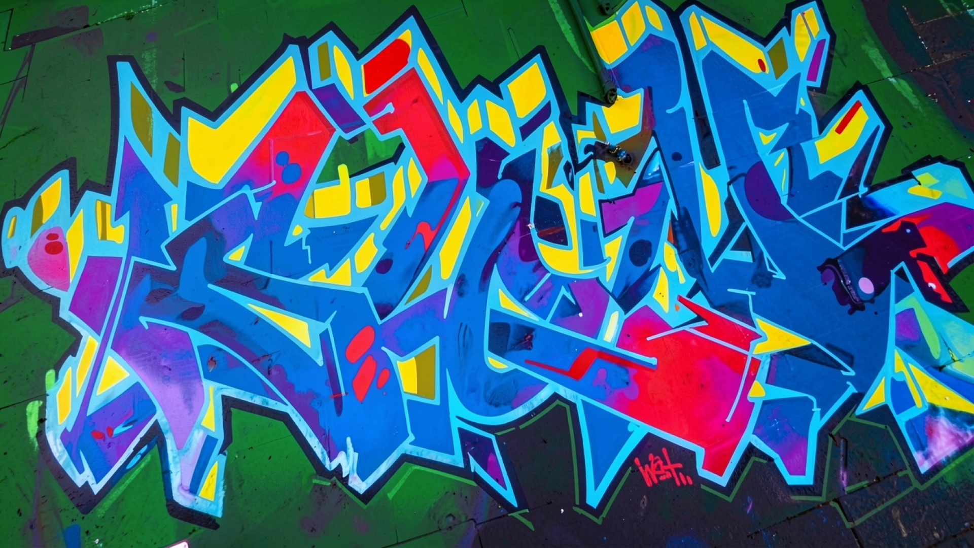 На нашем сайте вы можете скачать обои Граффити в синих тонах на зеленой стене в JPG для ПК или телефона – и вот почему: другие сайты обрезают края, но у нас полный кадр.