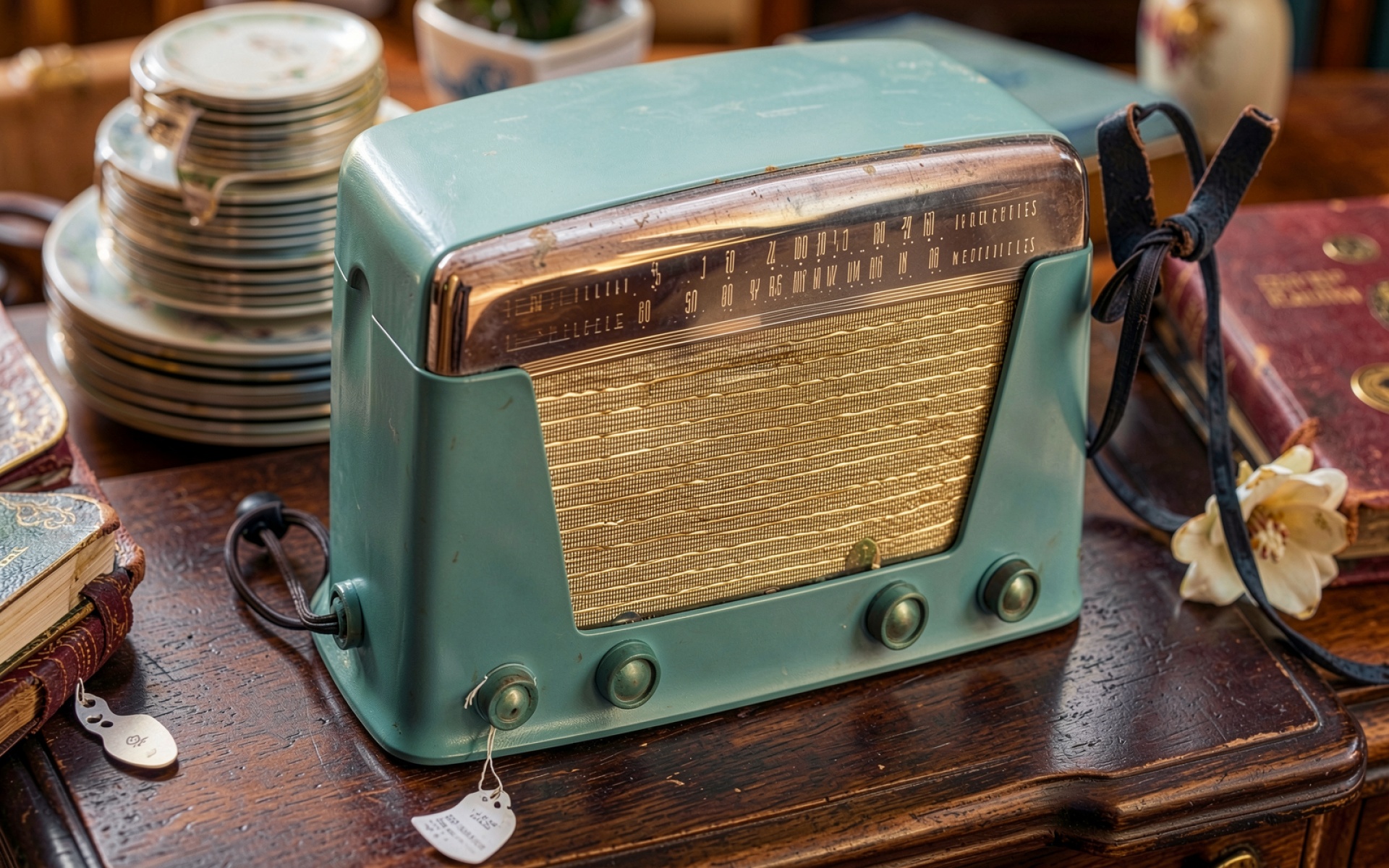 Объект представляет собой классический радиоприемник середины XX века с характерной шкалой настройки частот и аналоговыми регуляторами. Цветовая палитра выдержана в приглушенных пастельных тонах, где доминирует бирюзовый оттенок, контрастирующий с глубоким коричневым цветом антикварного стола. Согласно данным museumofmodernart.org, дизайн предметов быта этого периода сочетал функциональность и эстетику индустриального модернизма. Технически изображение обладает высокой плотностью пикселей, правильным балансом белого и естественным размытием заднего плана (боке), что акцентирует внимание на центральном объекте.