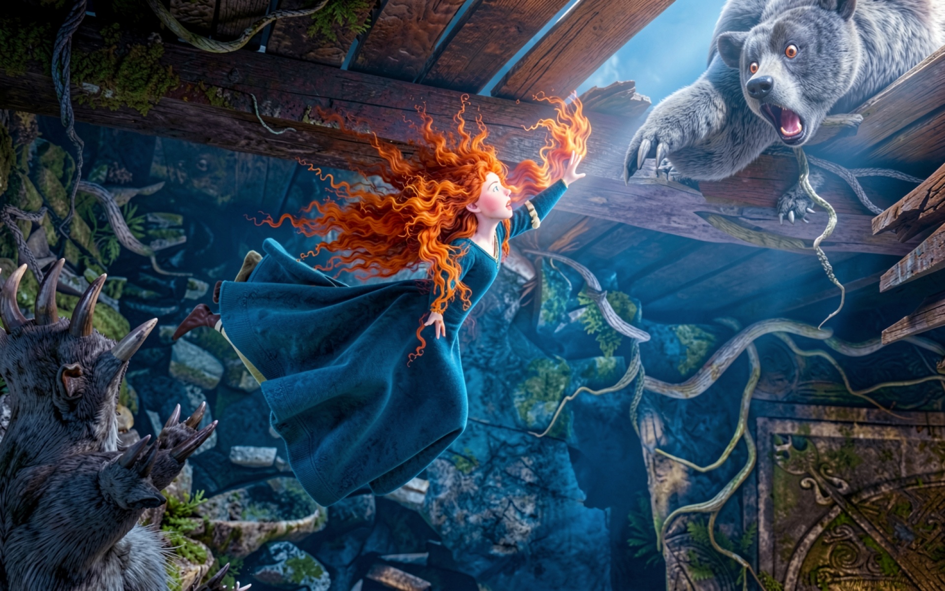 Композиция выделяется контрастом между насыщенным медным оттенком волос и глубокими синими тонами платья. Освещение имитирует холодный дневной свет, проникающий сверху, что создает четкие блики на шерсти медведя и мягкие градиенты в тенях каменных сводов. Текстуры дерева и скал переданы детально, а предпросмотр на сайте позволяет оценить качество цветопередачи перед сохранением файла.
