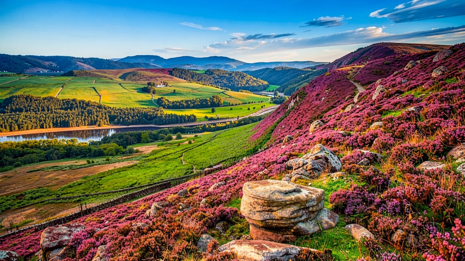 Композиция представляет собой панорамный вид на холмистую местность, где доминируют пурпурные массивы цветущего вереска и зеленые луга. Цветовая гамма построена на контрасте насыщенного фиолетового и ярко-зеленого оттенков под чистым голубым небом с кучевыми облаками. Технически снимок характеризуется высокой резкостью переднего плана, где видны гранитные валуны, и плавным переходом в атмосферную перспективу дальних гор. Согласно данным nationalgeographic.com, подобные ландшафты характерны для высокогорных пустошей, где специфический состав почвы способствует массовому цветению эрики.