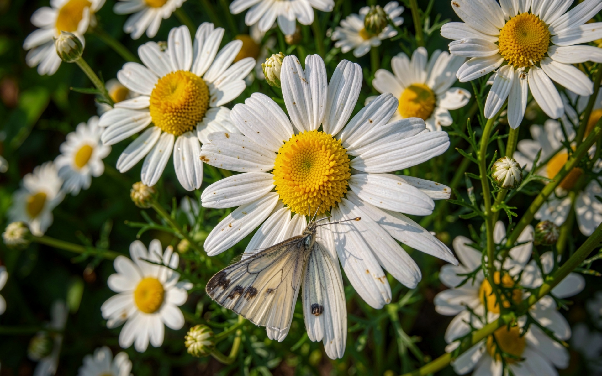 Композиция построена на контрасте ярко-желтых сердцевин ромашек и чистого белого цвета лепестков. Бабочка расположена в центре кадра, что создает естественную точку фокусировки. Технически изображение характеризуется высокой резкостью в центральной области и мягким боке на заднем плане, что отделяет главный объект от окружающей зелени. Согласно данным britannica.com, структура крыльев чешуекрулых позволяет им создавать уникальные цветовые паттерны для маскировки или привлечения партнеров. Цветовая гамма снимка сбалансирована по экспозиции, что исключает пересветы на белых участках.