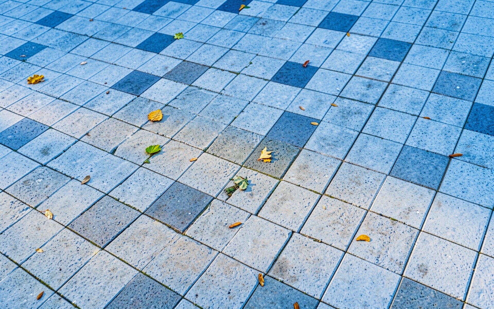 Изображение детально передает шероховатую текстуру бетонных плит и контраст между холодным голубым оттенком камня и теплыми тонами осенней листвы. Мягкое рассеянное освещение создает плавные градиенты на поверхности, подчеркивая микрорельеф материала и четкие границы швов. На сайте доступен удобный предпросмотр перед загрузкой для оценки качества отображения на экране.