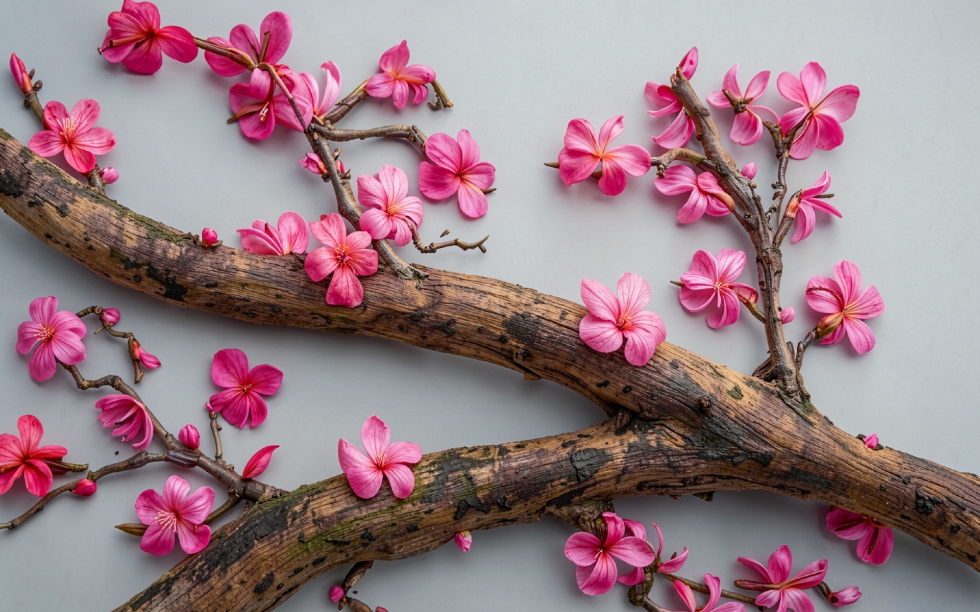 Изображение детально передает шероховатую текстуру коры с ее естественными трещинами и глубокими коричневыми тонами. Лепестки цветов имеют мягкий градиент от насыщенного розового к светлому, а освещение создает четкие акценты на изгибах ветвей. Нейтральный светлый фон подчеркивает контраст между органическими формами и минималистичным окружением. На сайте доступен удобный предпросмотр перед скачиванием для оценки качества на экране.