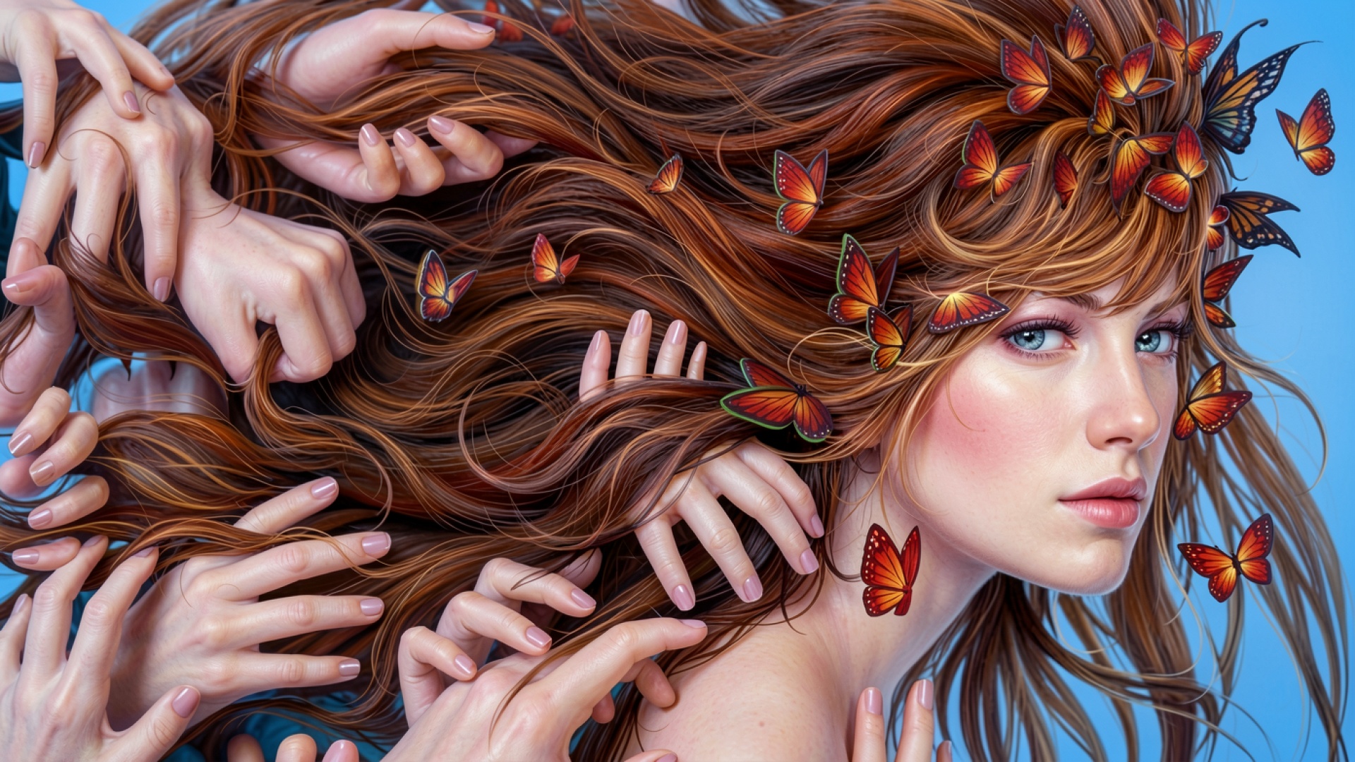 Изображение отличается детальной проработкой текстуры волос, где каждый локон имеет выраженные блики и глубокие тени. Оранжевые крылья бабочек создают контрастные акценты на фоне голубого градиента заднего плана. Мягкое освещение подчеркивает кожу лица и создает плавные переходы света. На сайте доступен удобный предпросмотр перед скачиванием, чтобы оценить качество отображения на вашем экране.