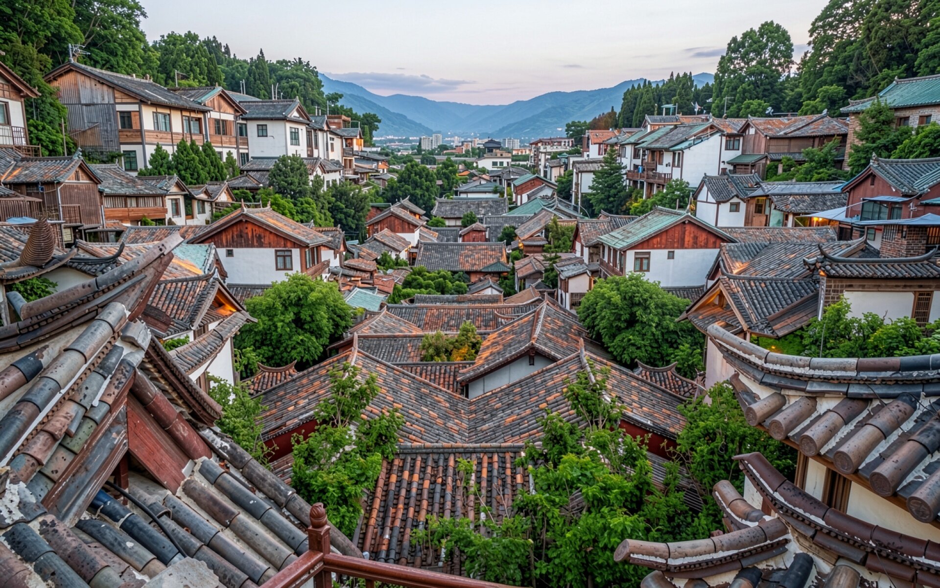 Изображение детально передает текстуру старой черепицы и деревянных балок, создавая глубокий объем за счет мягкого вечернего освещения. Градиенты неба плавно переходят от светлых тонов к синеве горных вершин, а тени в узких пролетах между зданиями подчеркивают архитектурную сложность поселения. На сайте доступен удобный предпросмотр перед загрузкой, чтобы оценить качество отображения всех элементов на вашем экране.