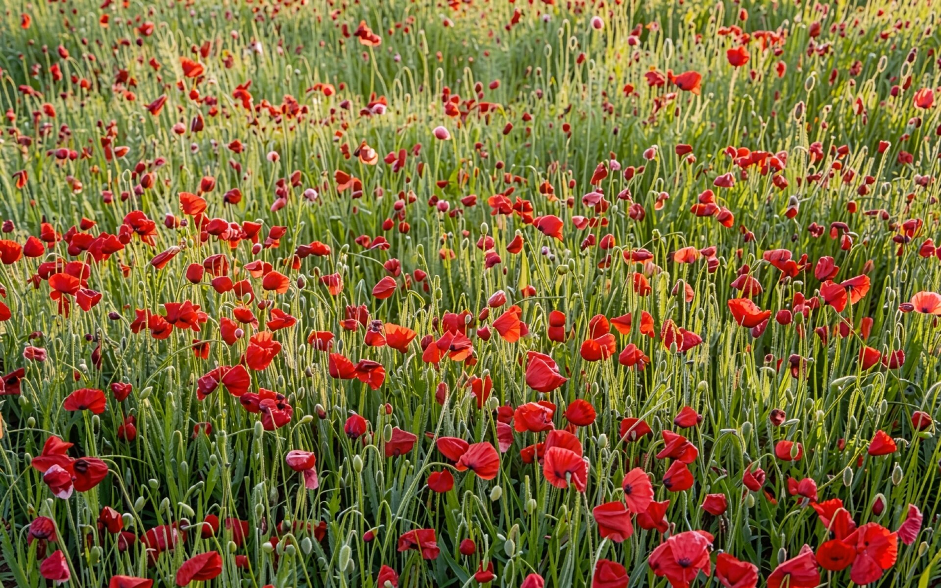 Поле красных маков в лучах утреннего солнца обои