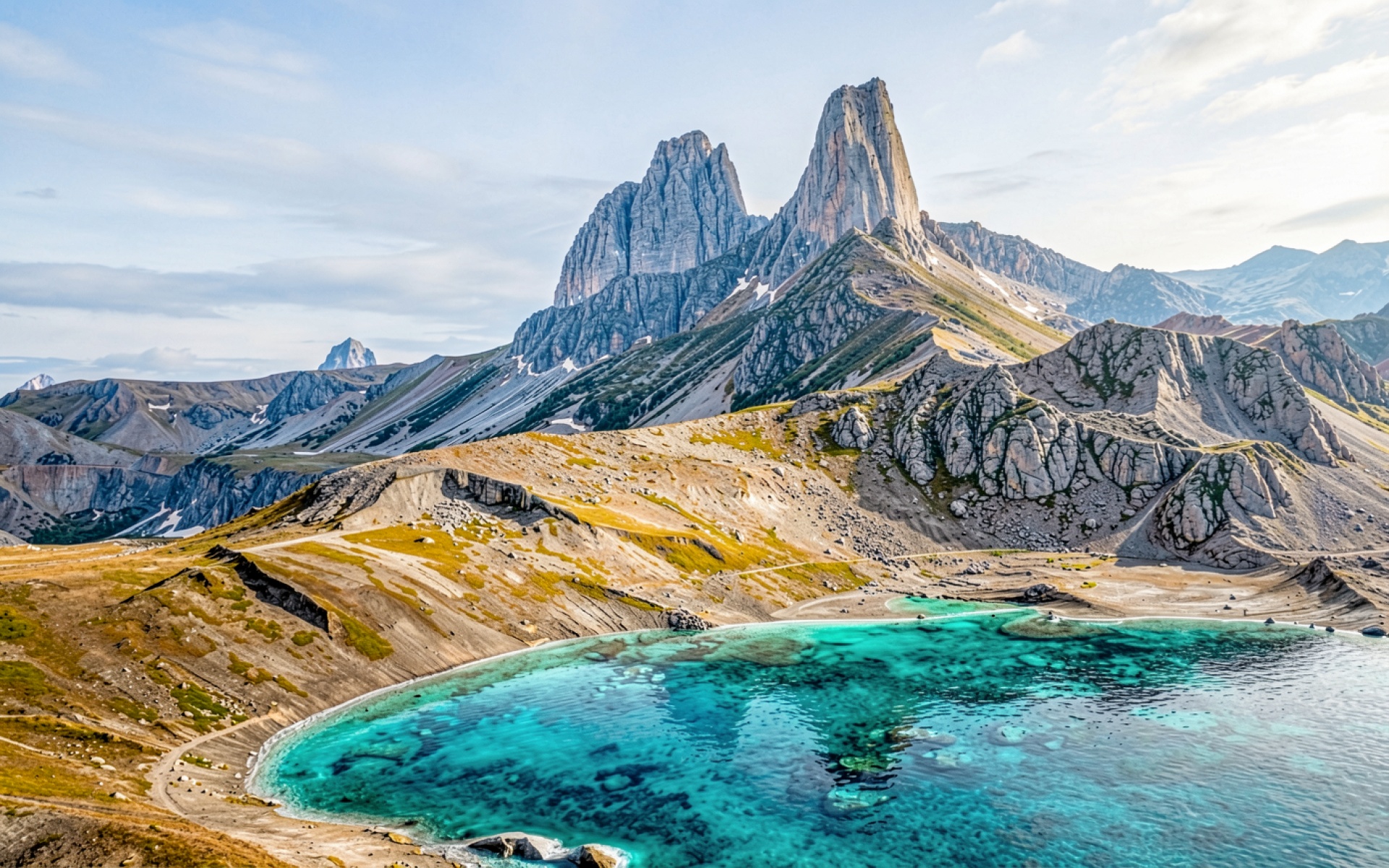 Изображение передает контраст между холодными оттенками воды и грубой текстурой известняковых пород. Освещение подчеркивает острые грани пиков и создает мягкие градиенты на поверхности озера. Детализация скал включает микрорельеф камня, глубокие тени в расщелинах и светлые блики на вершинах. На сайте доступен удобный предпросмотр перед загрузкой для оценки качества на экране.