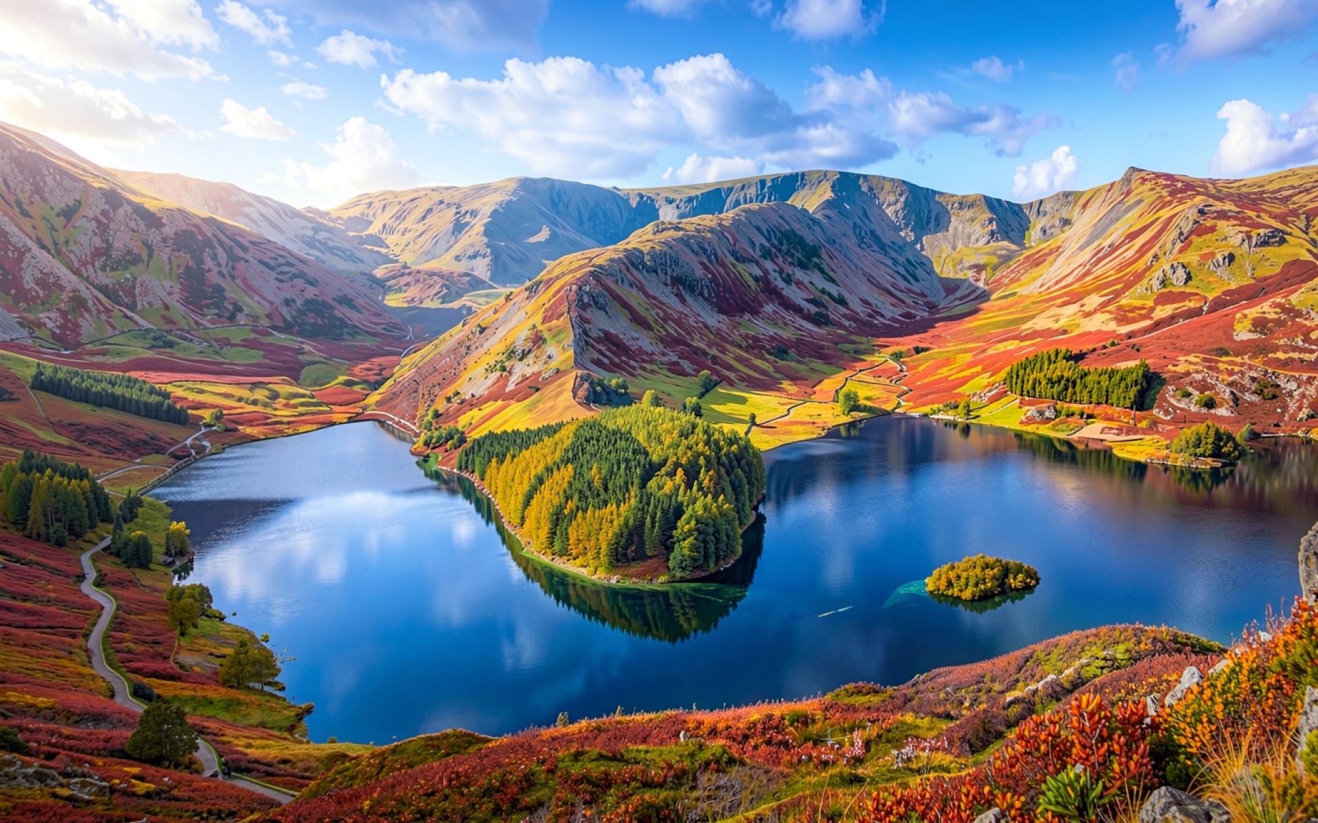 Изображение характеризуется высокой детализацией текстур скалистых склонов и мягким градиентом неба. Освещение создает выразительные контрасты между глубокими тенями в расщелинах гор и яркими бликами на поверхности воды. Насыщенные охристые и красные оттенки растительности плавно переходят в темно-зеленые массивы хвойных деревьев. Сайт предоставляет удобный предпросмотр перед загрузкой, чтобы оценить качество отображения всех элементов сцены на вашем экране.