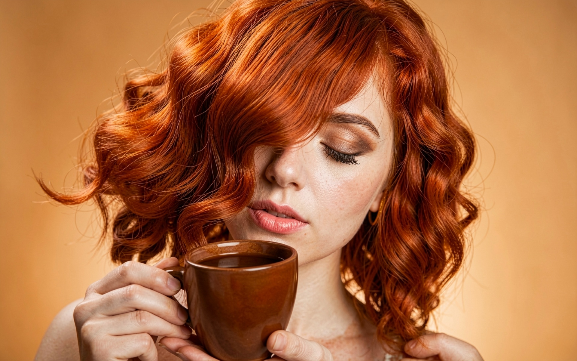 Скачайте это изображение в высоком разрешении, чтобы использовать его как эстетичный фон для рабочего стола или в дизайне социальных сетей. Снимок отличается глубокой проработкой цветовой гаммы и акцентом на текстуры волос и керамики.