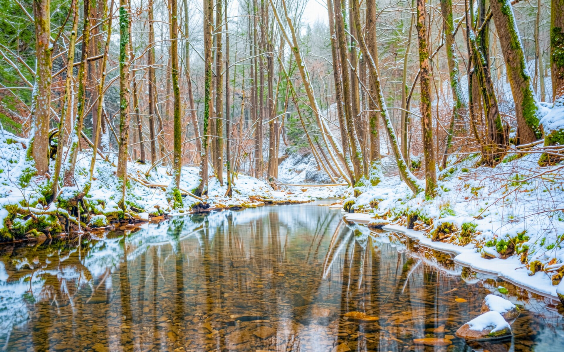 Изображение передает детальную текстуру коры деревьев и рыхлого снежного покрова. Освещение мягкое, рассеянное, что создает плавные градиенты на поверхности воды и подчеркивает контраст между белым снегом и темными стволами. Зеркальные отражения в ручье создают глубокую перспективу, а блики на камнях добавляют сцене объема. На сайте доступен удобный предпросмотр перед скачиванием для оценки качества на экране.