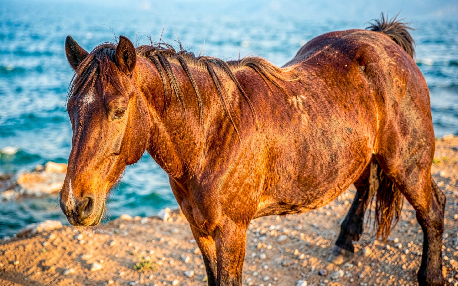 Рыжая лошадь на берегу синего моря обои