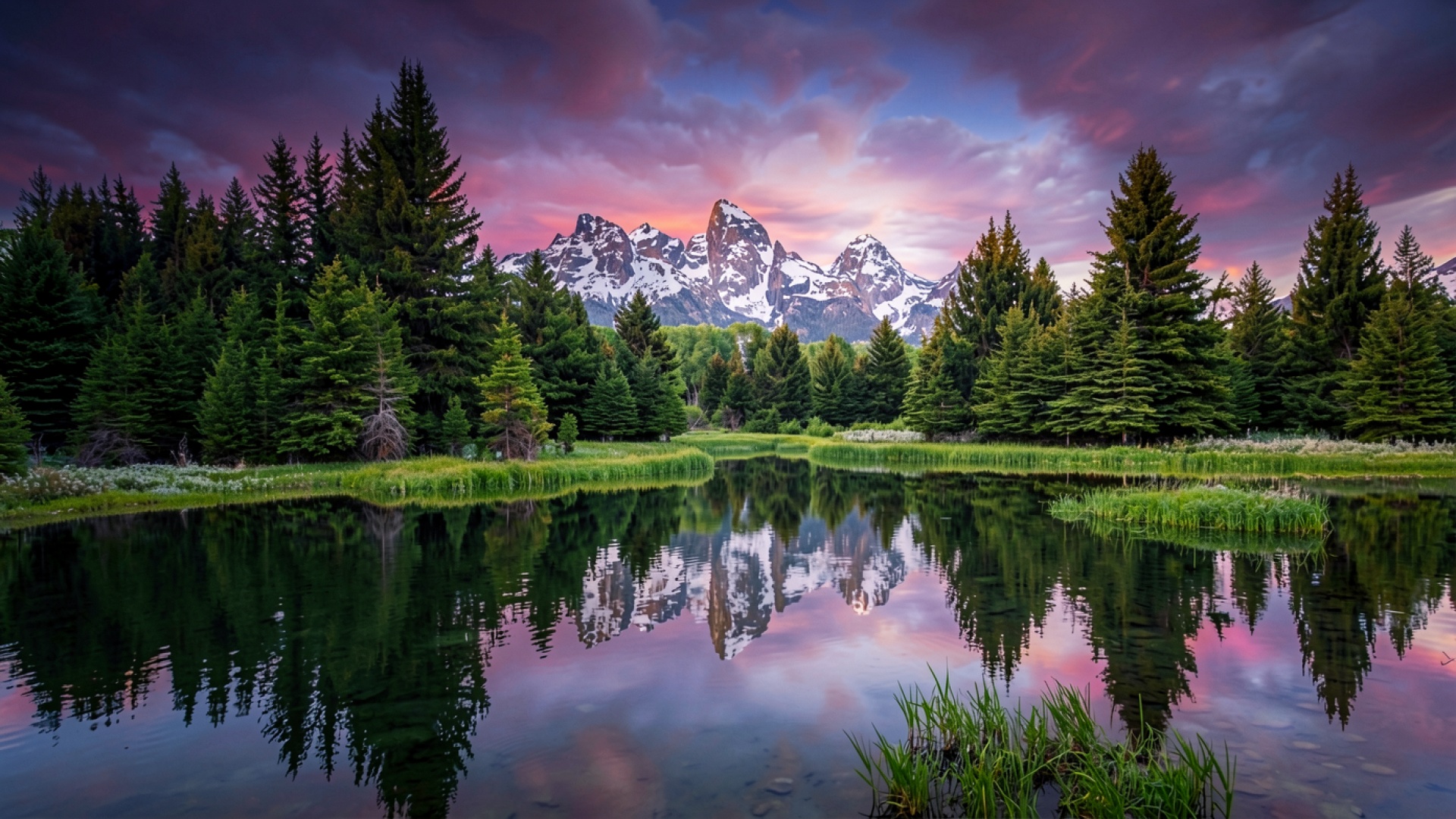 Изображение характеризуется глубокими контрастами между темной хвоей елей и ярко-белыми заснеженными пиками. Градиенты вечернего неба переходят от пурпурного к темно-синему, создавая мягкое освещение всей сцены. Особое внимание уделено зеркальной поверхности воды, где четко видны блики и тени горных массивов. Текстура скал передана детально, а передний план с зеленой травой дополняет композицию естественным объемом. На сайте доступен удобный предпросмотр перед загрузкой для оценки качества на экране.
