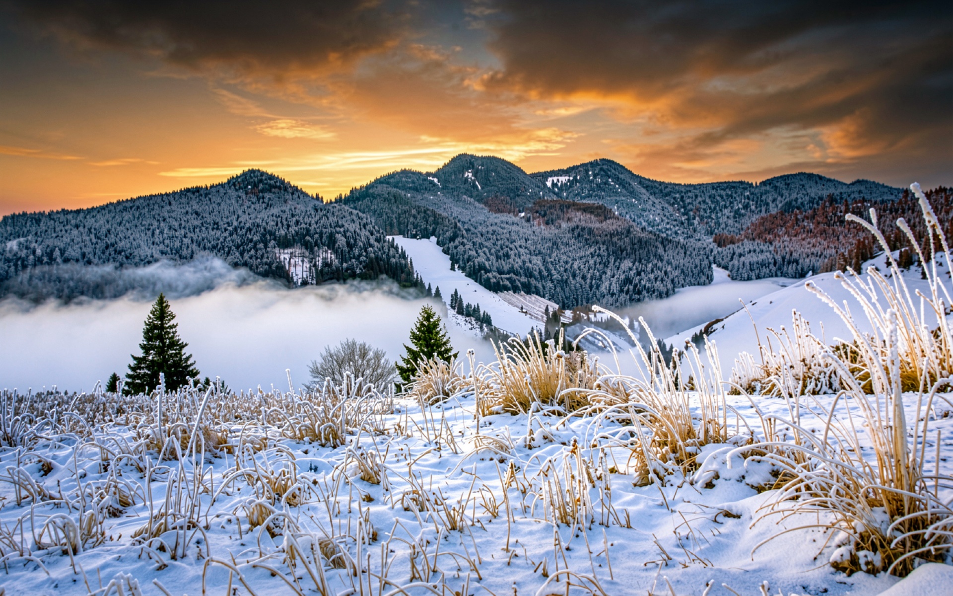 Изображение детально передает текстуру инея на переднем плане и плотность хвойного леса на склонах. Освещение характеризуется мягким переходом от глубоких синих теней в низинах к яркому золотистому градиенту неба. Контраст между холодным снегом и теплым светом заката создает объемную композицию, где туман в долине служит естественным разделителем планов. На сайте доступен удобный предпросмотр перед загрузкой для оценки качества на экране.
