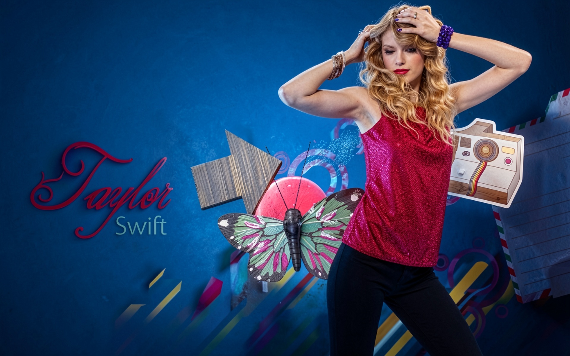 Тейлор Свифт в красном топе на синем фоне обои