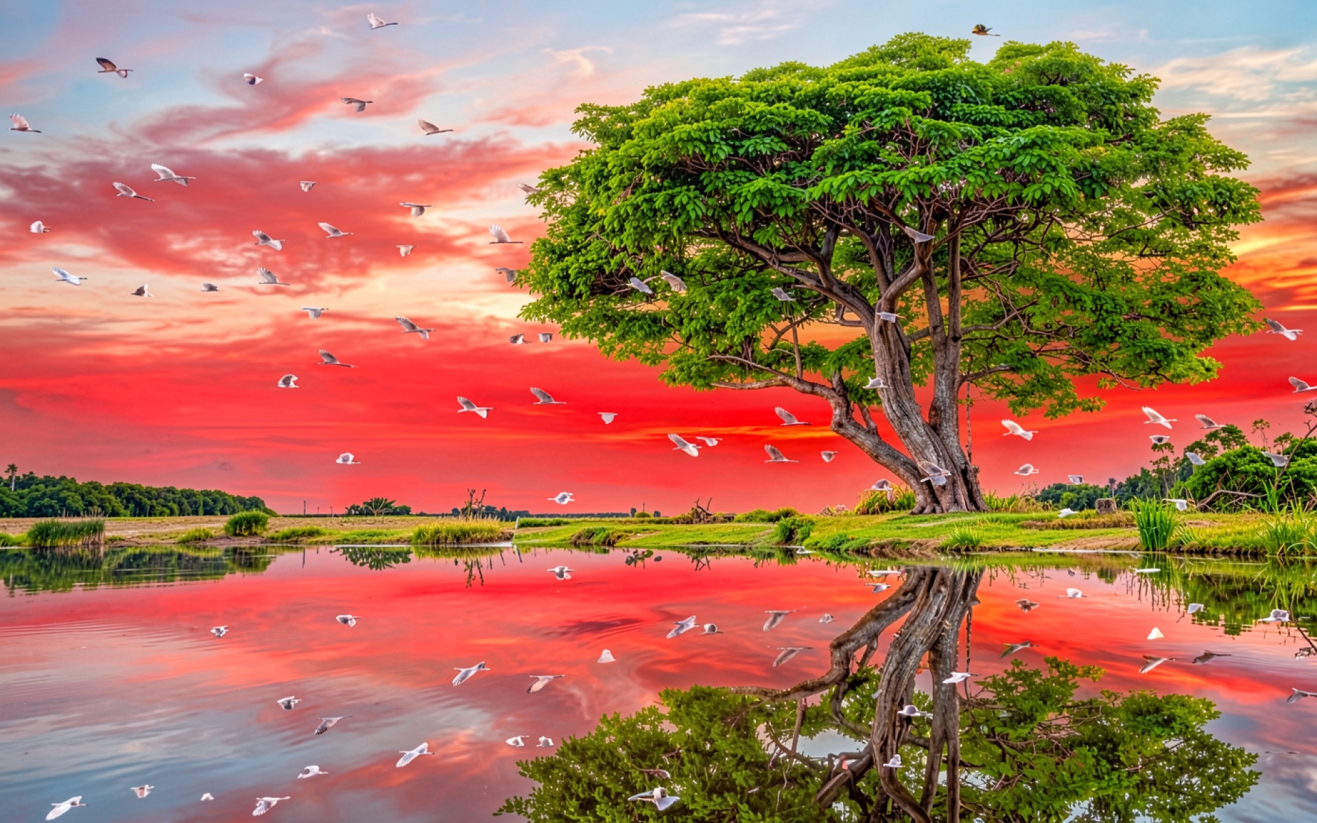 Зеленое дерево с белыми птицами на закате обои