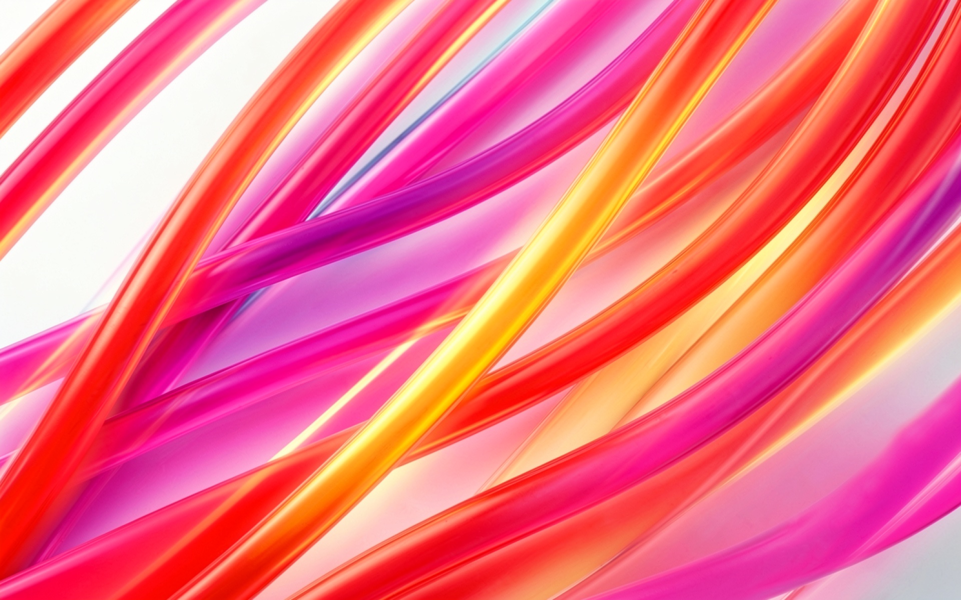 Изображение характеризуется плавными изгибами глянцевых линий с выраженным эффектом преломления света. Текстуры имитируют полированное стекло, где яркие блики контрастируют с глубокими тенями в местах пересечения элементов. Цветовые градиенты переходят от насыщенного алого к золотисто-желтому на чистом светлом фоне. Перед загрузкой доступен удобный предпросмотр для оценки качества отображения всех световых акцентов на вашем экране.