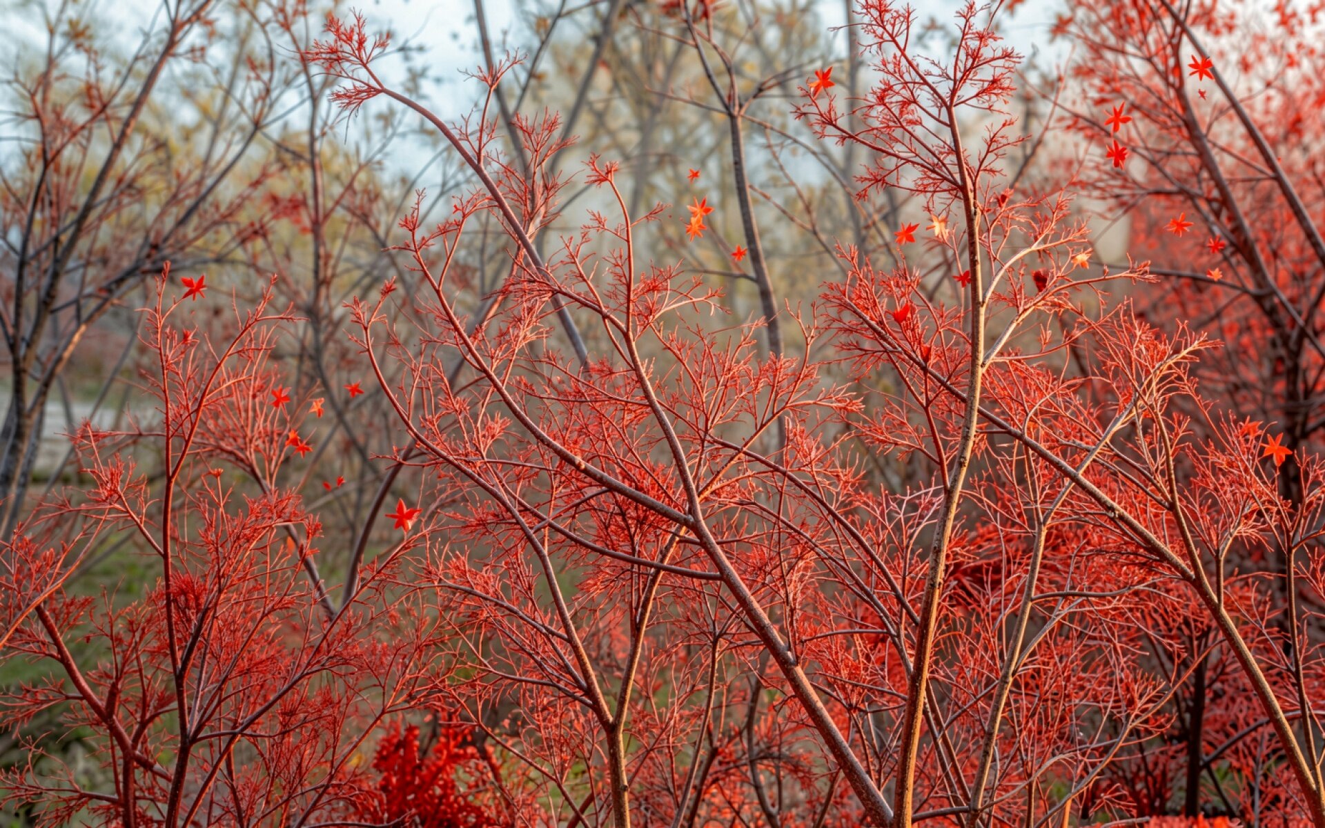Согласно данным из botanicalgarden.org, интенсивный красный цвет осенних ветвей обусловлен синтезом антоцианов, которые защищают ткани растения от фотоокисления при низких температурах. Нажмите кнопку скачивания, чтобы установить эти обои с кустарником на ваш ПК или телефон прямо сейчас.