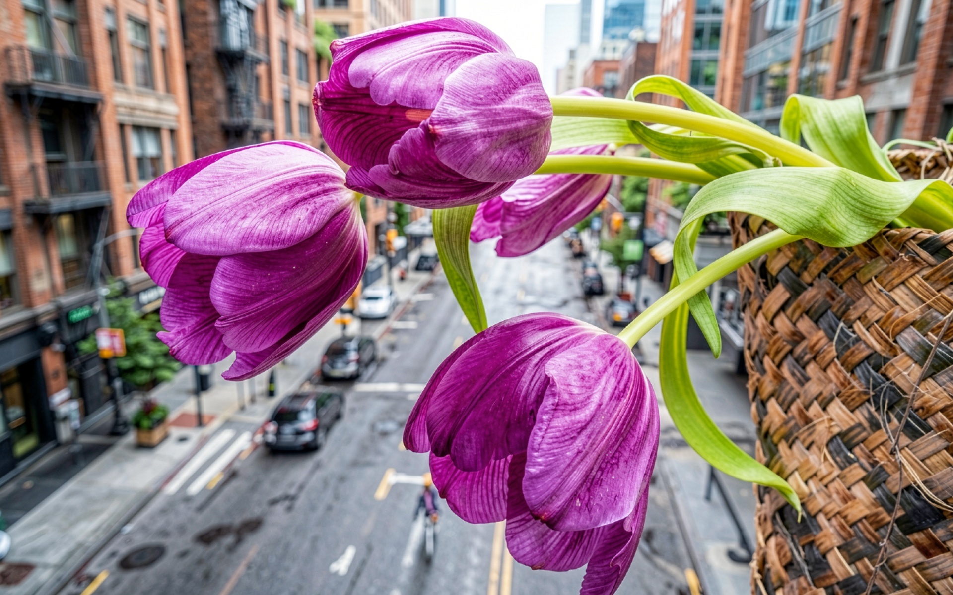Загрузка JPG обоев Фиолетовые тюльпаны в плетеной корзине на фоне города с нашего сайта необходима потому что изображение прошло минимальное сжатие с сохранением деталей.