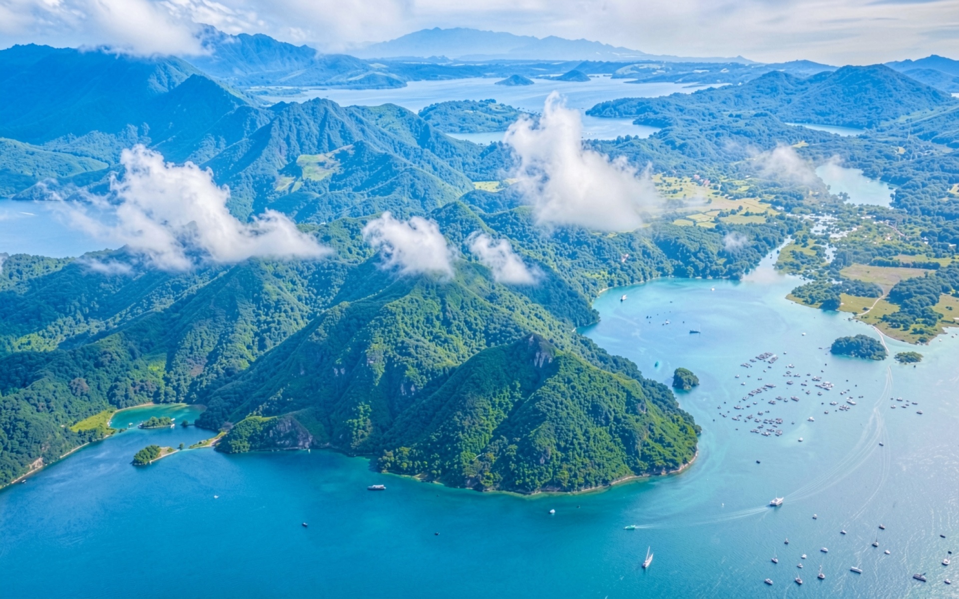 Изображение детально передает текстуру густой зеленой растительности на склонах гор и плавные градиенты лазурного цвета в прибрежной зоне. Освещение имитирует яркий зенитный свет, создавая четкие контрасты между освещенными вершинами и глубокими тенями в складках рельефа. Белые облака имеют мягкую растушевку краев, что добавляет глубины пространственной композиции. На сайте доступен удобный предпросмотр перед загрузкой для оценки качества на экране.