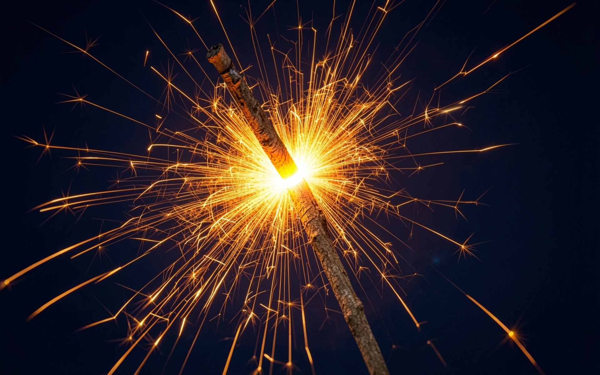 Техническое исполнение кадра акцентирует внимание на контрасте между глубоким темно-синим фоном и ярко-желтыми искрами. Текстура металлического стержня передана четко, видны блики от центрального источника света и мягкие градиенты в зонах затухания свечения. Динамичные линии искр создают сложную геометрию теней и ярких точек. На сайте предусмотрен удобный предпросмотр перед загрузкой, чтобы оценить качество отображения на вашем экране.