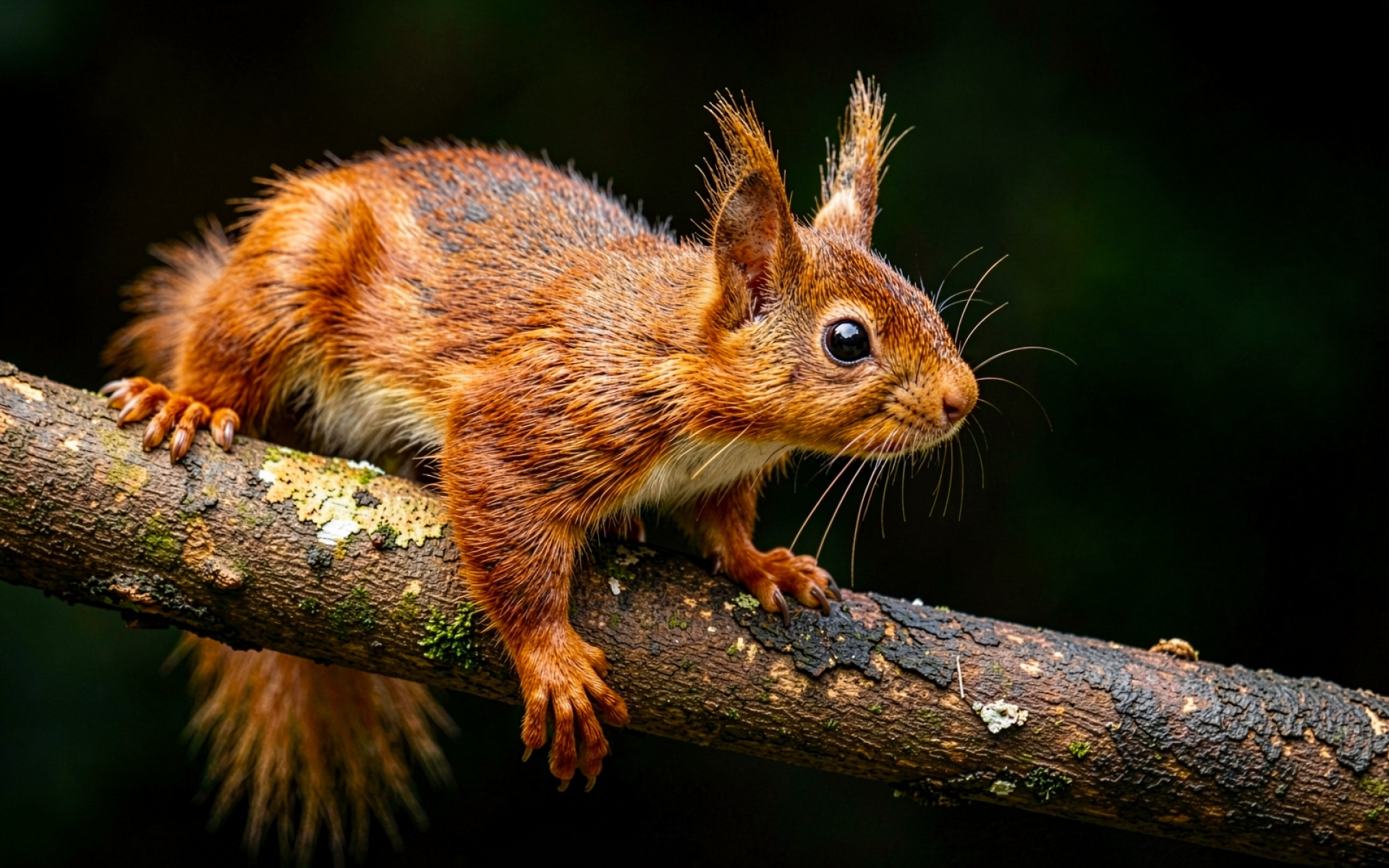 На снимке запечатлена Sciurus vulgaris с характерными кисточками на ушах и насыщенным рыжим окрасом. Композиция построена на контрасте между детально проработанным объектом и глубоким темным фоном, что создает эффект объема. Технически изображение характеризуется высокой плотностью пикселей и правильным балансом белого. Согласно данным nationalgeographic.com, такая детализация позволяет изучать анатомические особенности грызунов без использования микроскопа. Особое внимание уделено резкости вибрисс (усов) и текстуре мха на ветке, что подтверждает использование оптики с большой диафрагмой для размытия заднего плана.