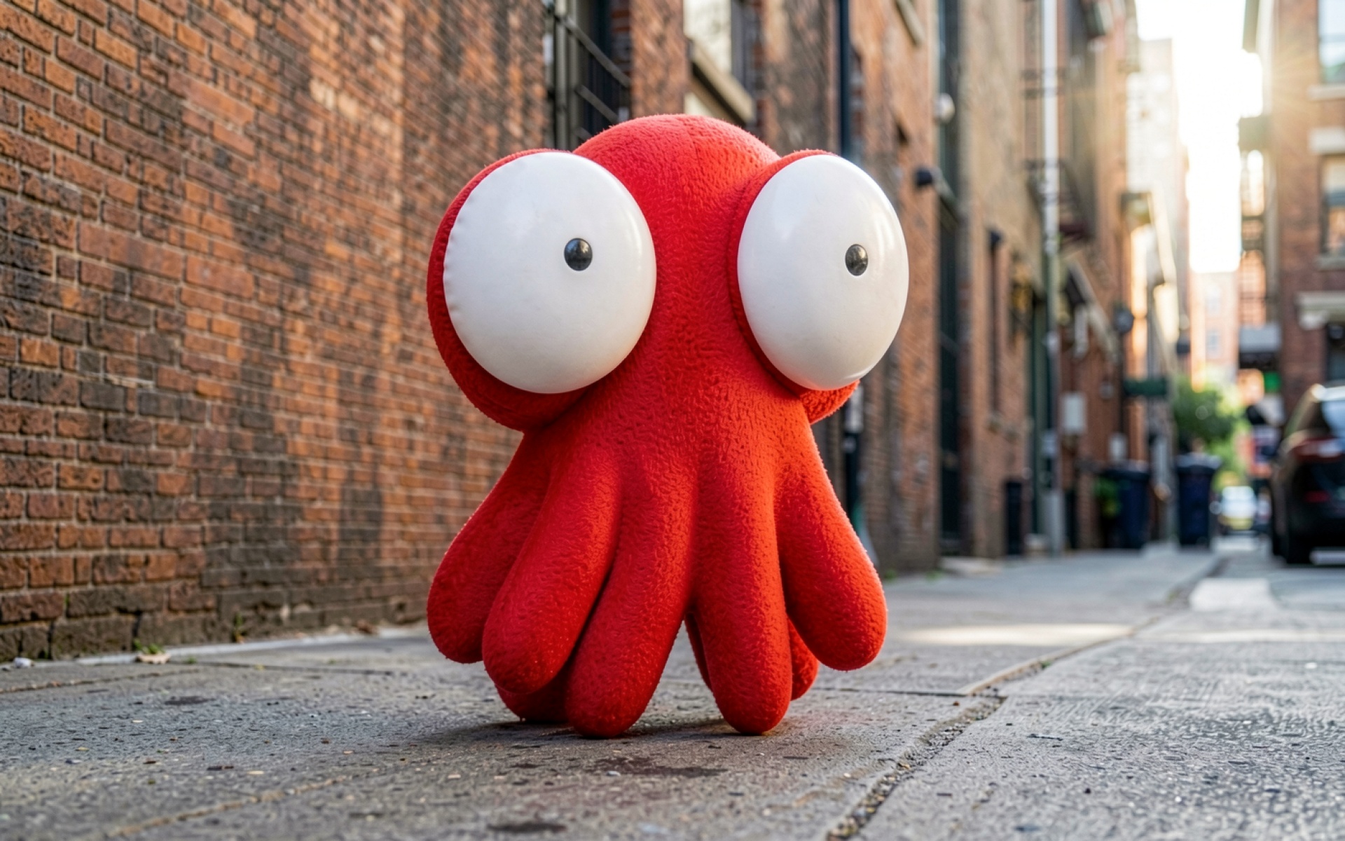 Скачайте с нашего сайта обои Красный плюшевый осьминог на городской улице в формате JPG, так как здесь нет полосатого градиента из-за низкого битрейта.