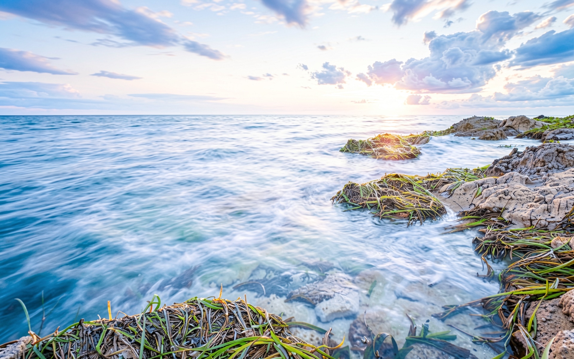 Морской берег с камнями при закате обои