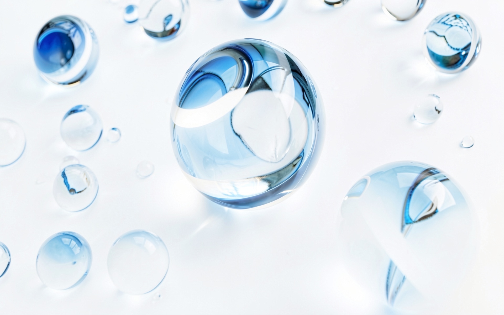Изображение демонстрирует сложные оптические свойства стекла, включая четкие блики и плавные градиенты голубых оттенков внутри сфер. Особое внимание уделено преломлению света и мягким теням на поверхности, которые создают объем и глубину композиции. На сайте доступен удобный предпросмотр перед скачиванием для оценки качества отображения на экране.
