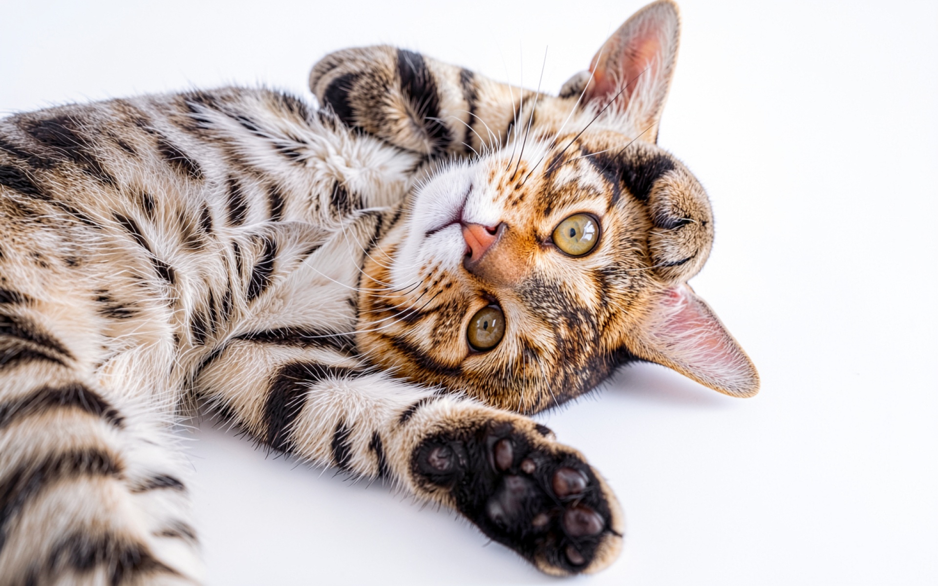 Изображение детально передает текстуру короткой шерсти с характерными розетками и контрастными темными полосами. Мягкое фронтальное освещение минимизирует жесткие тени, создавая плавные градиенты на белом фоне и подчеркивая блеск глаз. Акценты расставлены на деталях подушечек лап и тонких вибриссах. Сайт предоставляет удобный предпросмотр перед загрузкой для оценки качества отображения на вашем экране.