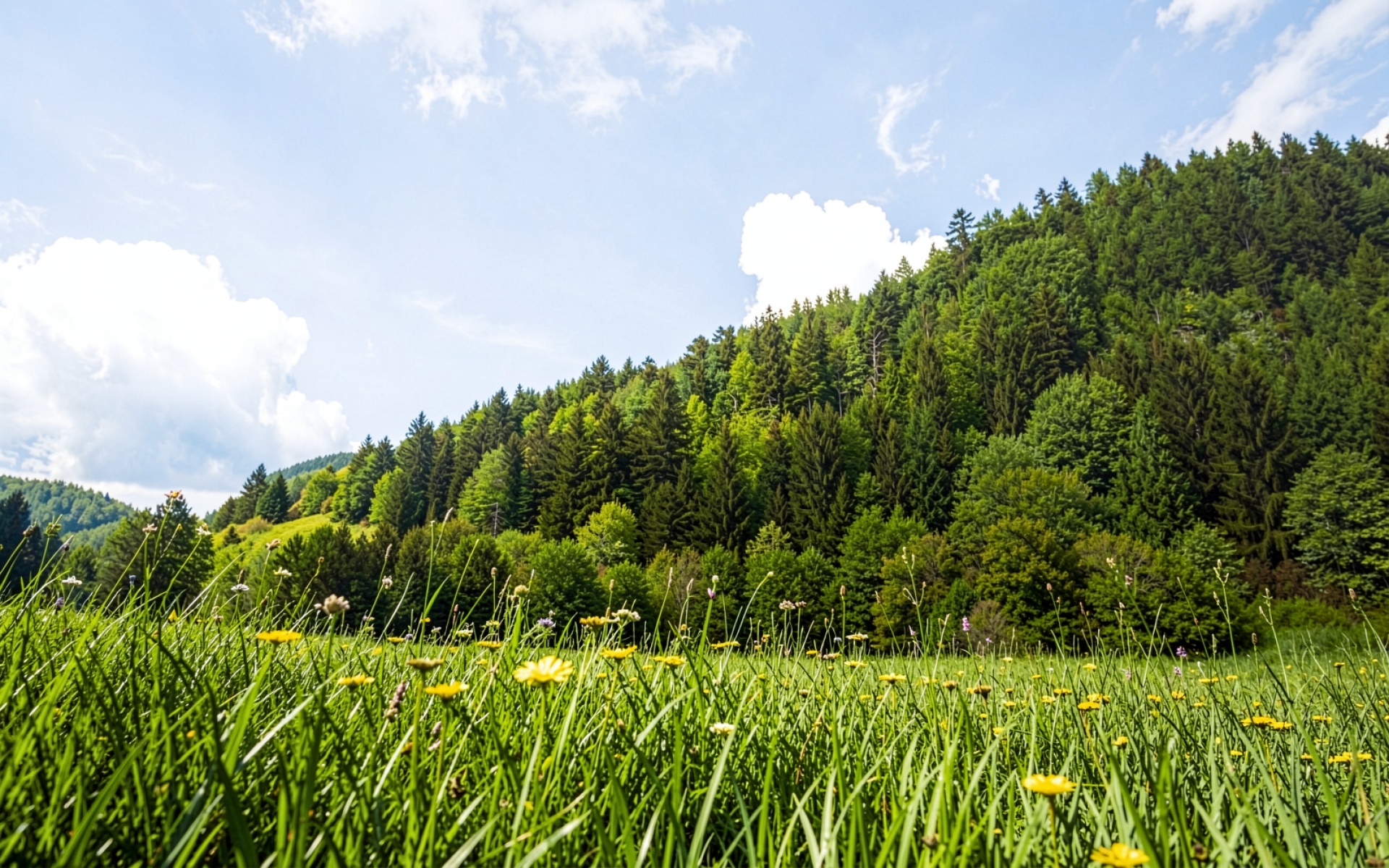 Скачайте это изображение высокого разрешения, чтобы обновить рабочий стол качественным природным фоном, который снижает визуальный стресс и создает атмосферу спокойствия. Снимок демонстрирует насыщенную зеленую палитру альпийского луга с желтыми полевыми цветами на переднем плане и густым хвойно-лиственным лесом на склоне горы.