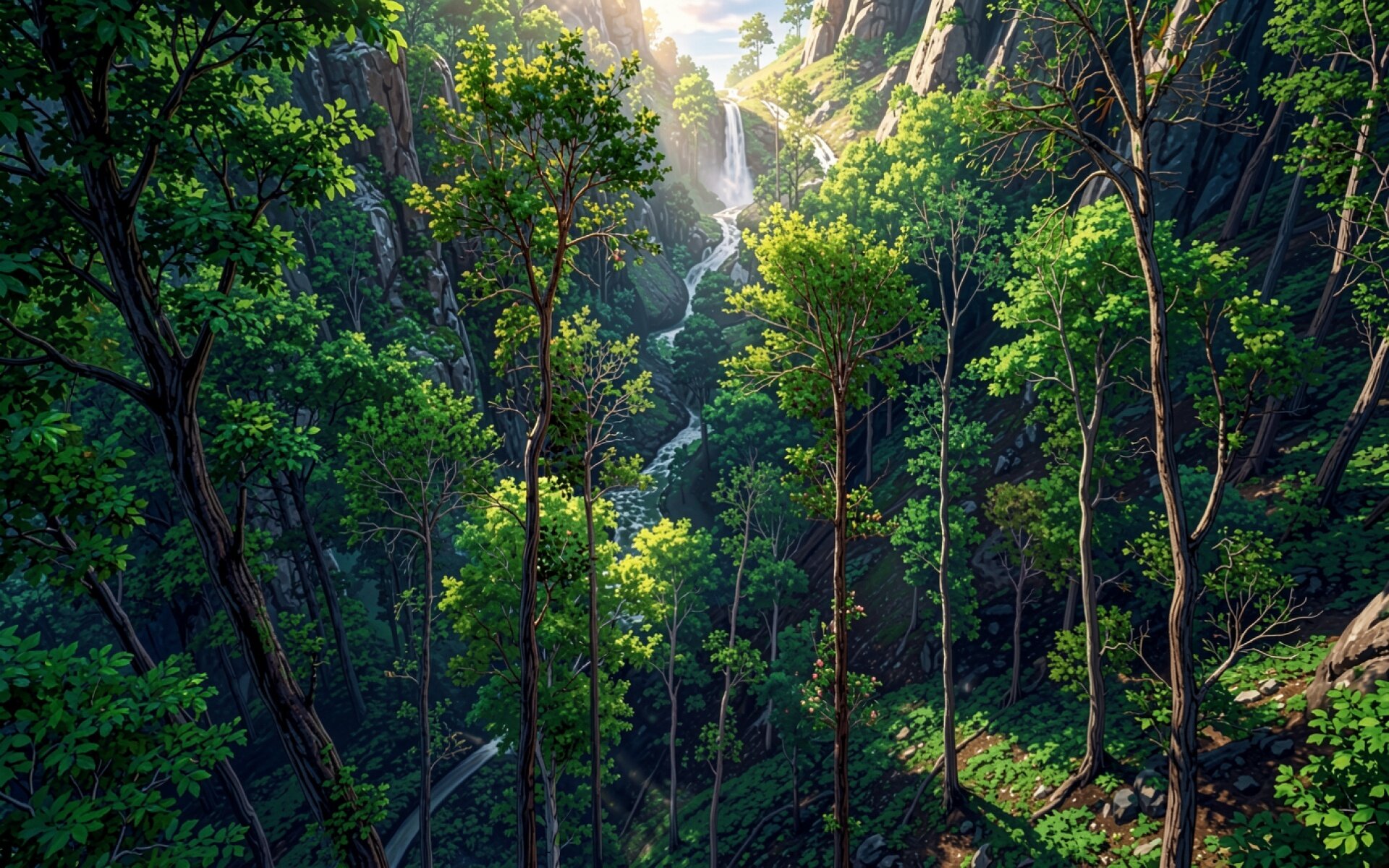 Изображение детально передает текстуру коры деревьев и глянцевую поверхность листвы. Освещение имитирует естественный солнечный свет, создавая мягкие градиенты в глубине каньона и яркие блики на струях падающей воды. Контрастные тени подчеркивают объем скальных пород и многослойность растительности. Перед загрузкой доступен удобный предпросмотр для оценки качества отображения всех элементов сцены на вашем экране.