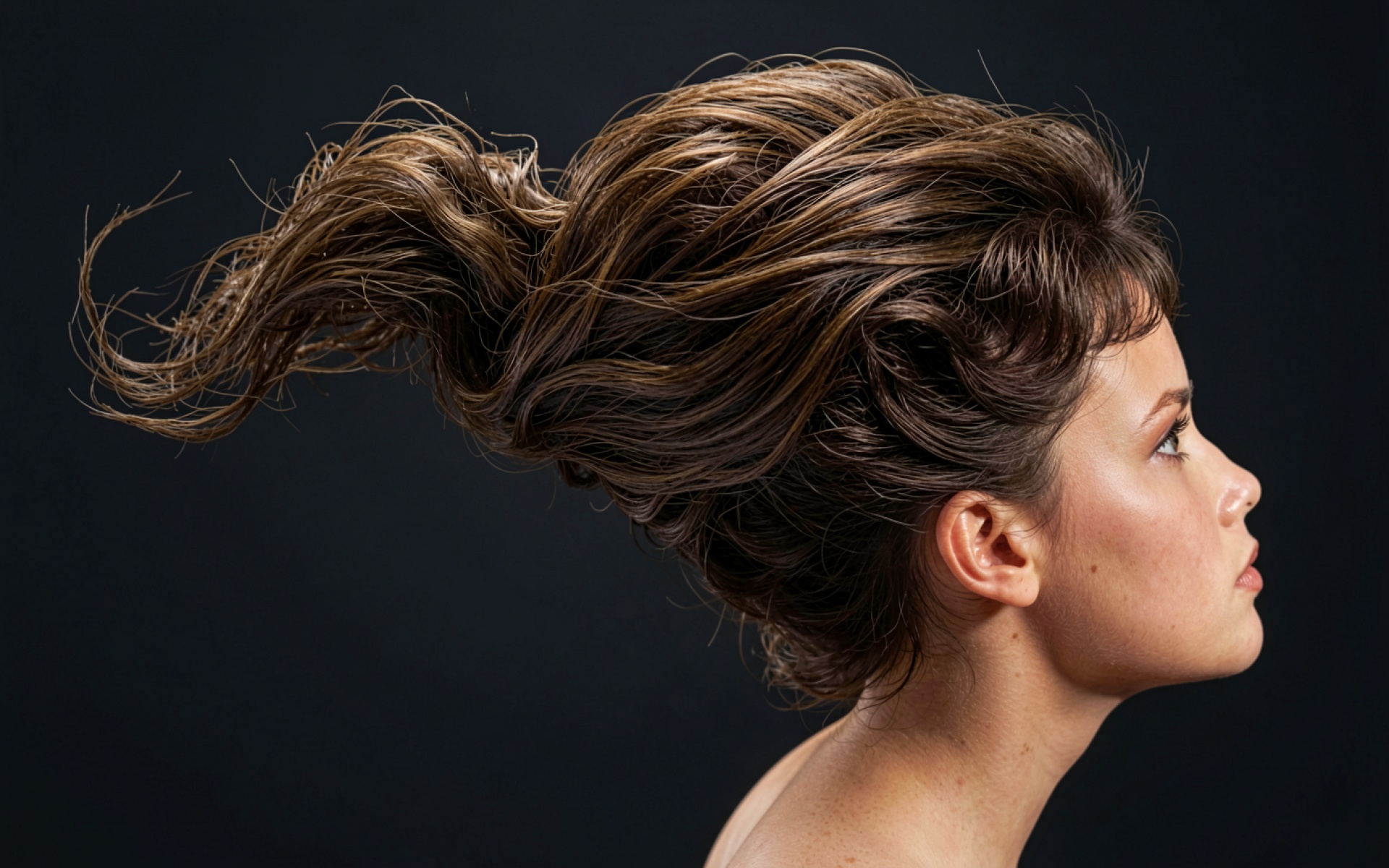 Профиль девушки с развевающимися каштановыми волосами на черном фоне обои