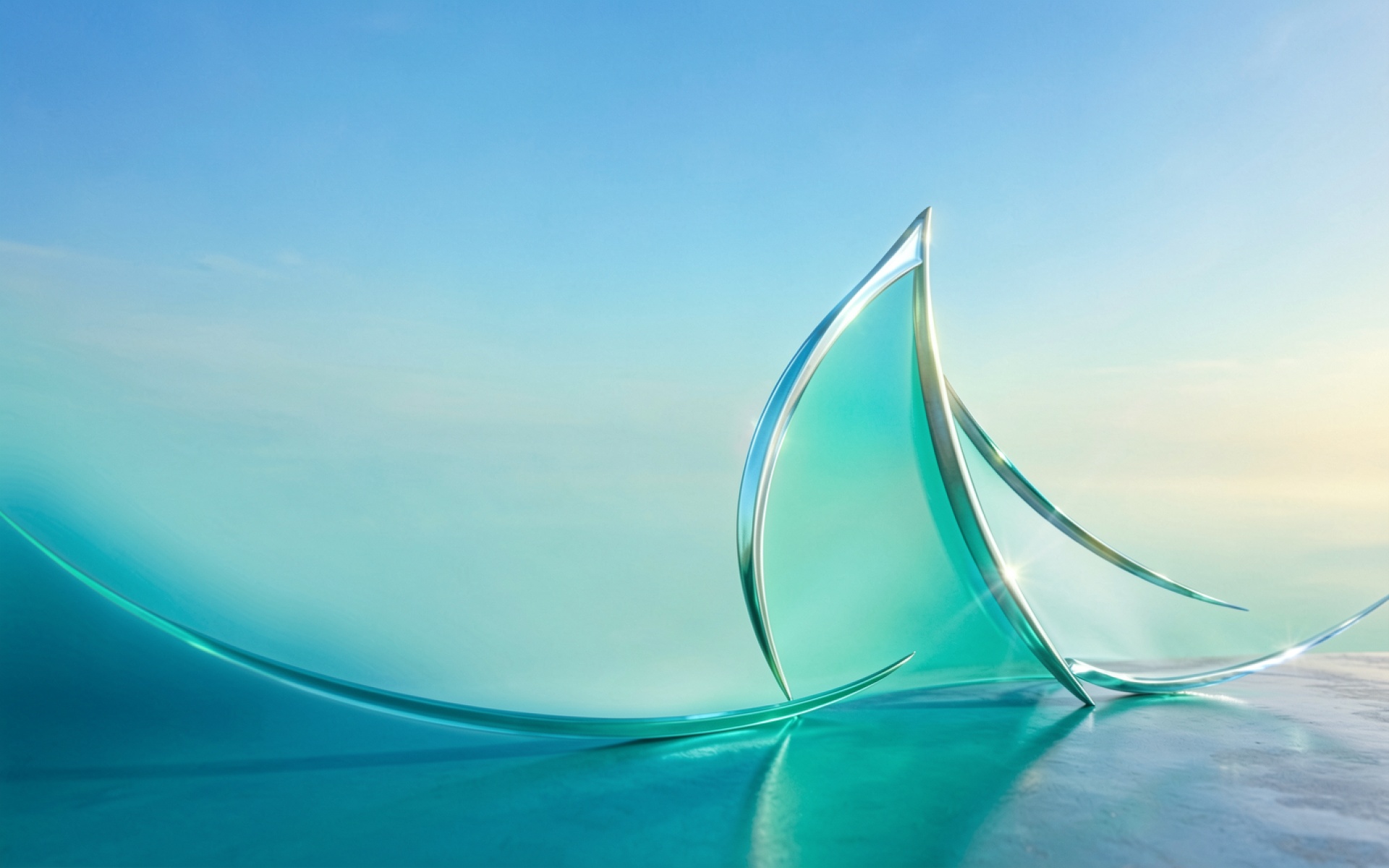 Изображение характеризуется плавными изгибами прозрачного материала с выраженным глянцевым блеском. Освещение создает четкие блики на острых кромках стеклянных форм, а мягкие тени подчеркивают объем объектов. Бирюзовые градиенты фона плавно переходят в светлые тона, создавая эффект воздушности и чистоты. На сайте доступен удобный предпросмотр перед скачиванием для оценки качества на экране.