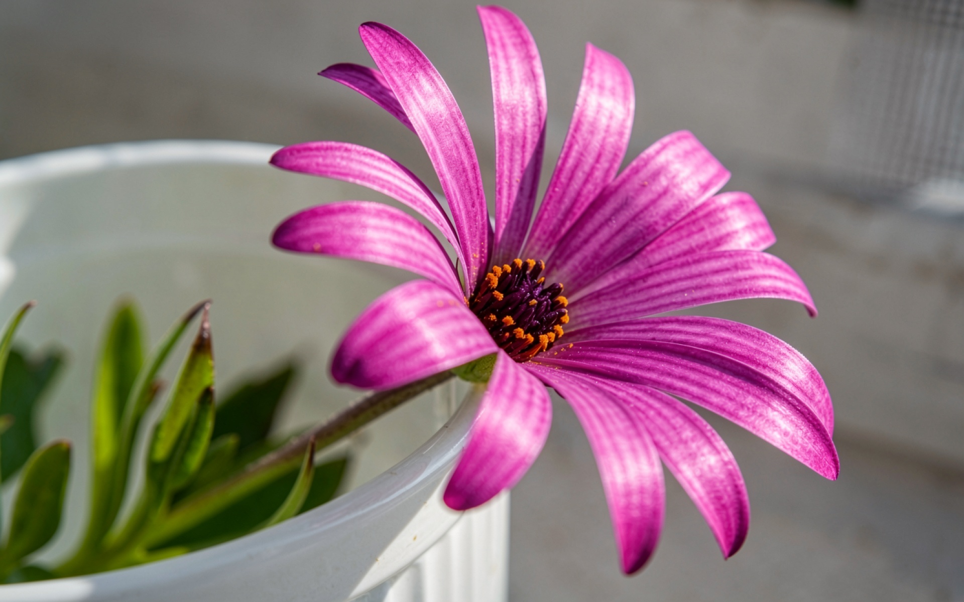 Доступны для скачивания JPG обои 'Розовый цветок остеоспермума в белом пластиковом горшке'. Почему стоит скачать их? Здесь нет полосатого градиента из-за низкого битрейта.