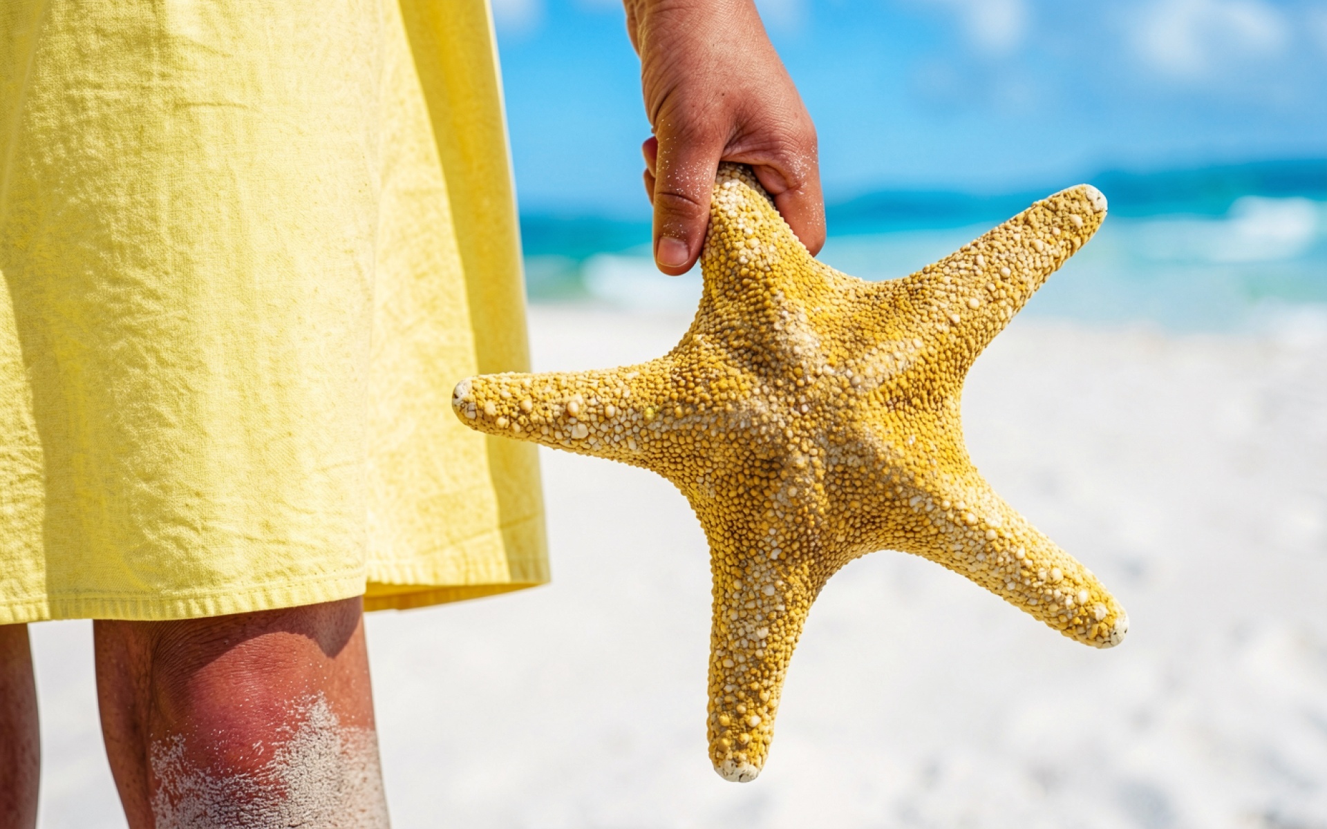 Изображение детально передает пористую текстуру кожного скелета иглокожего, подчеркивая каждую мелкую выпуклость. Естественное дневное освещение создает мягкие переходы между ярко-желтыми участками и глубокими тенями в складках тела. Фон с градиентом от белого песка к бирюзовой кромке океана обеспечивает правильный контраст. На сайте доступен удобный предпросмотр перед скачиванием, чтобы оценить качество отображения на экране.