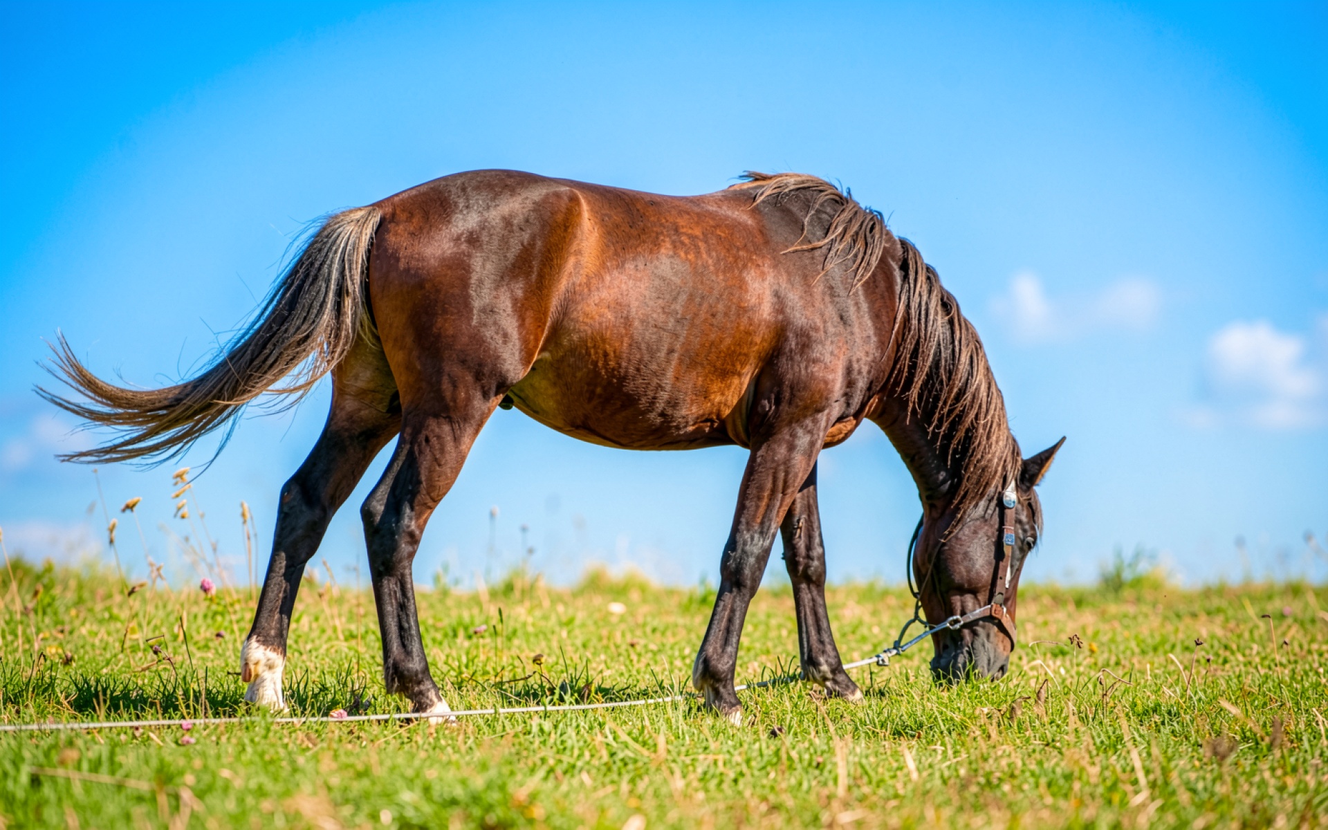 Коричневая лошадь на зеленом летнем лугу обои