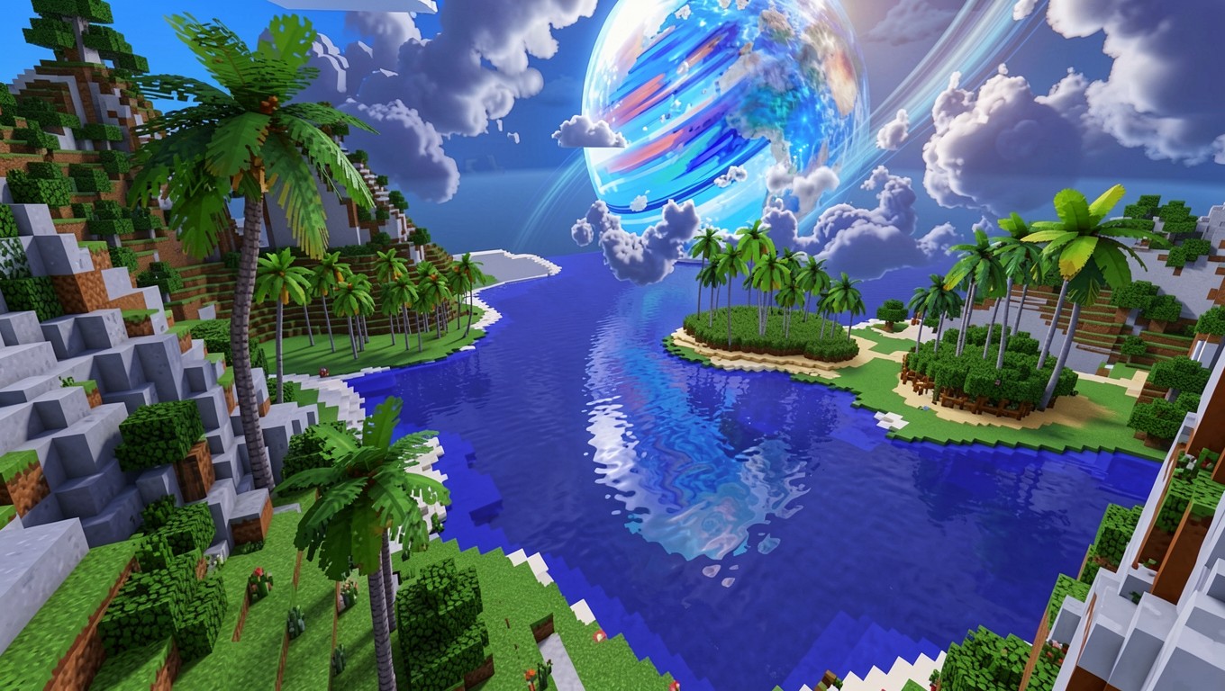 Изображение детально передает текстуру воксельных скал и гладкую поверхность синей воды. Освещение имитирует яркий дневной свет с мягкими градиентами на небе и четкими бликами на поверхности океана. Контраст между насыщенной зеленью листвы пальм и холодным оттенком далекой планеты создает глубину пространства. Перед загрузкой доступен удобный предпросмотр для оценки качества отображения всех элементов на экране.