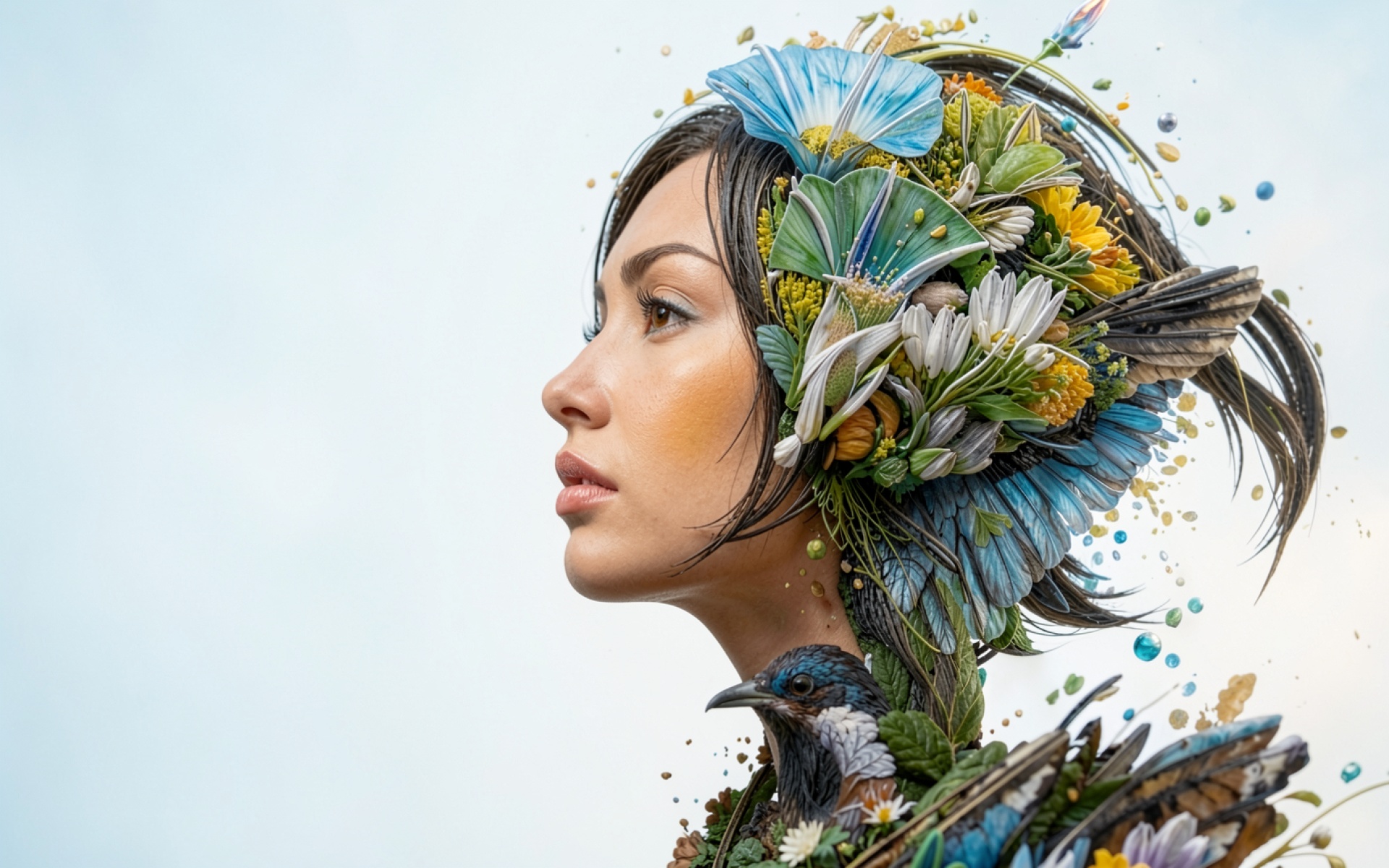 Скачайте JPG файл обоев Портрет девушки с цветами и птицей на нашем сайте – и вот причина: файл оптимизирован для установки на рабочий стол и экран телефона.