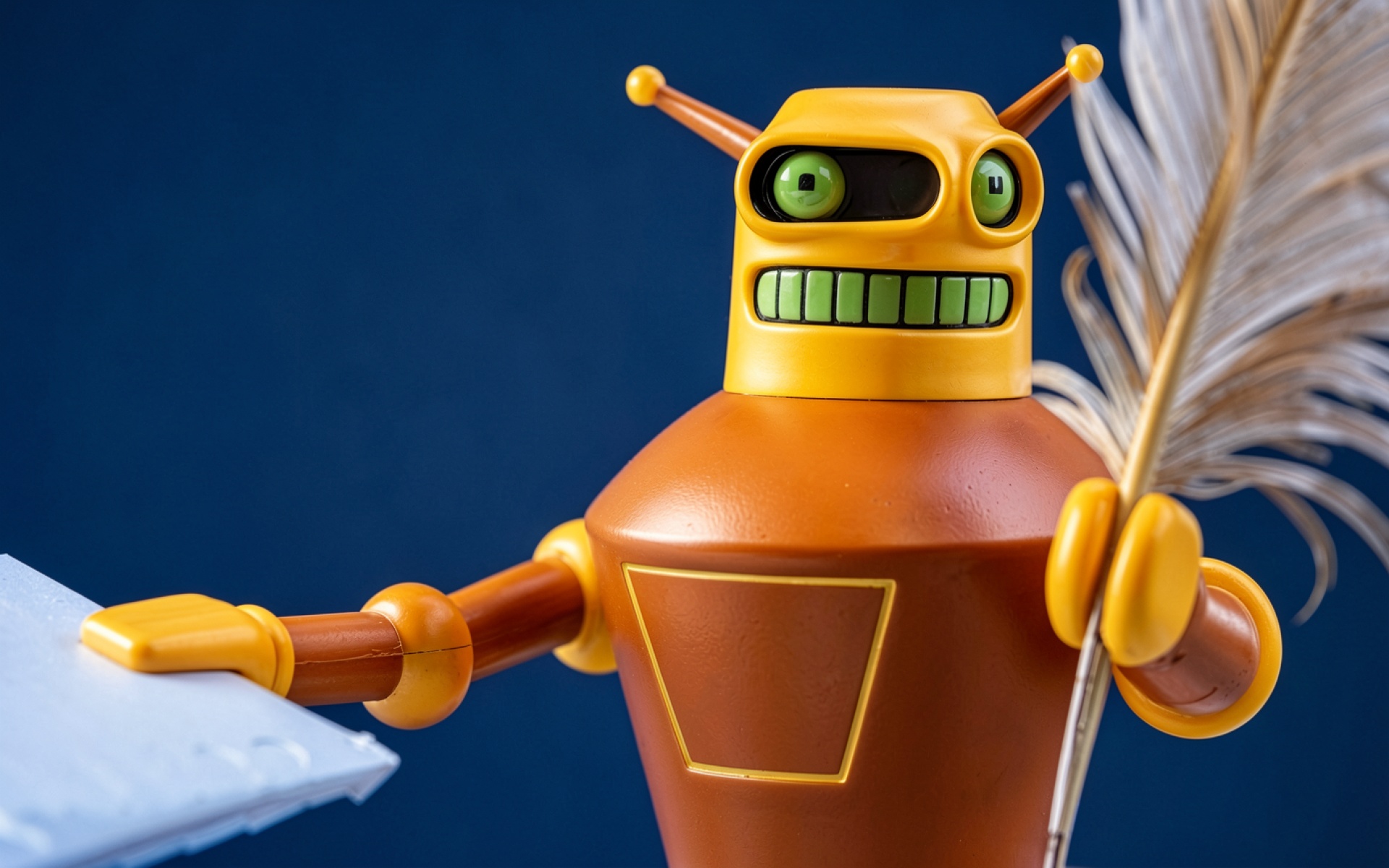 Желтый робот с пером на синем фоне обои