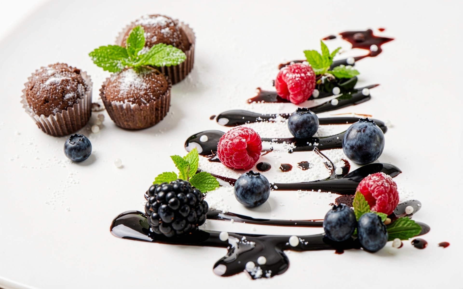 Изображение демонстрирует глянцевую текстуру шоколадного соуса с четкими бликами и глубокими тенями. Матовые поверхности шоколадных трюфелей контрастируют с ворсистой структурой листьев мяты и зернистостью сахарной пудры. Плавные градиенты белого фона подчеркивают насыщенный красный цвет малины и темно-синий оттенок черники. На сайте доступен удобный предпросмотр перед скачиванием для оценки качества на экране.