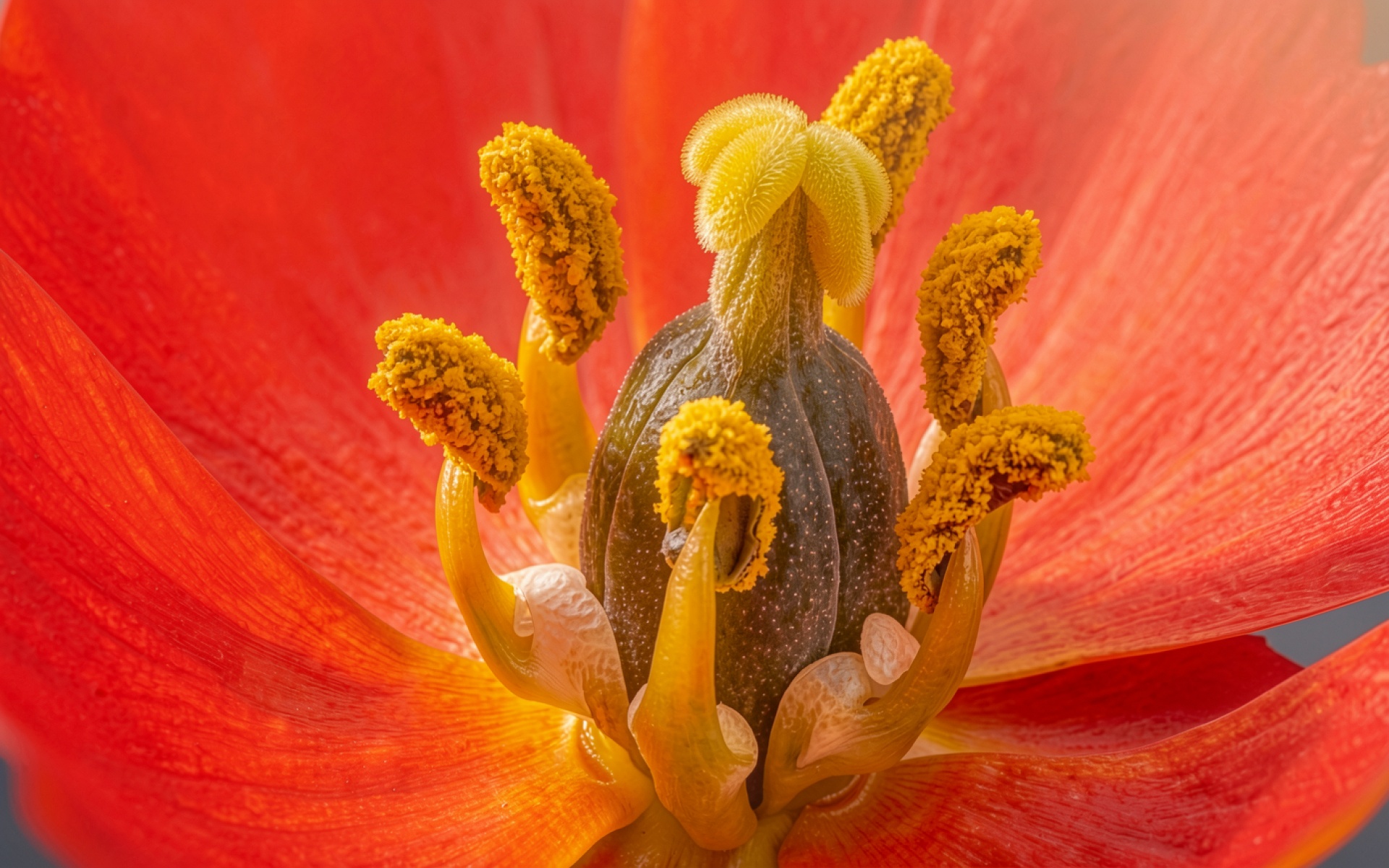 Макросъемка красного тюльпана с желтой пыльцой обои