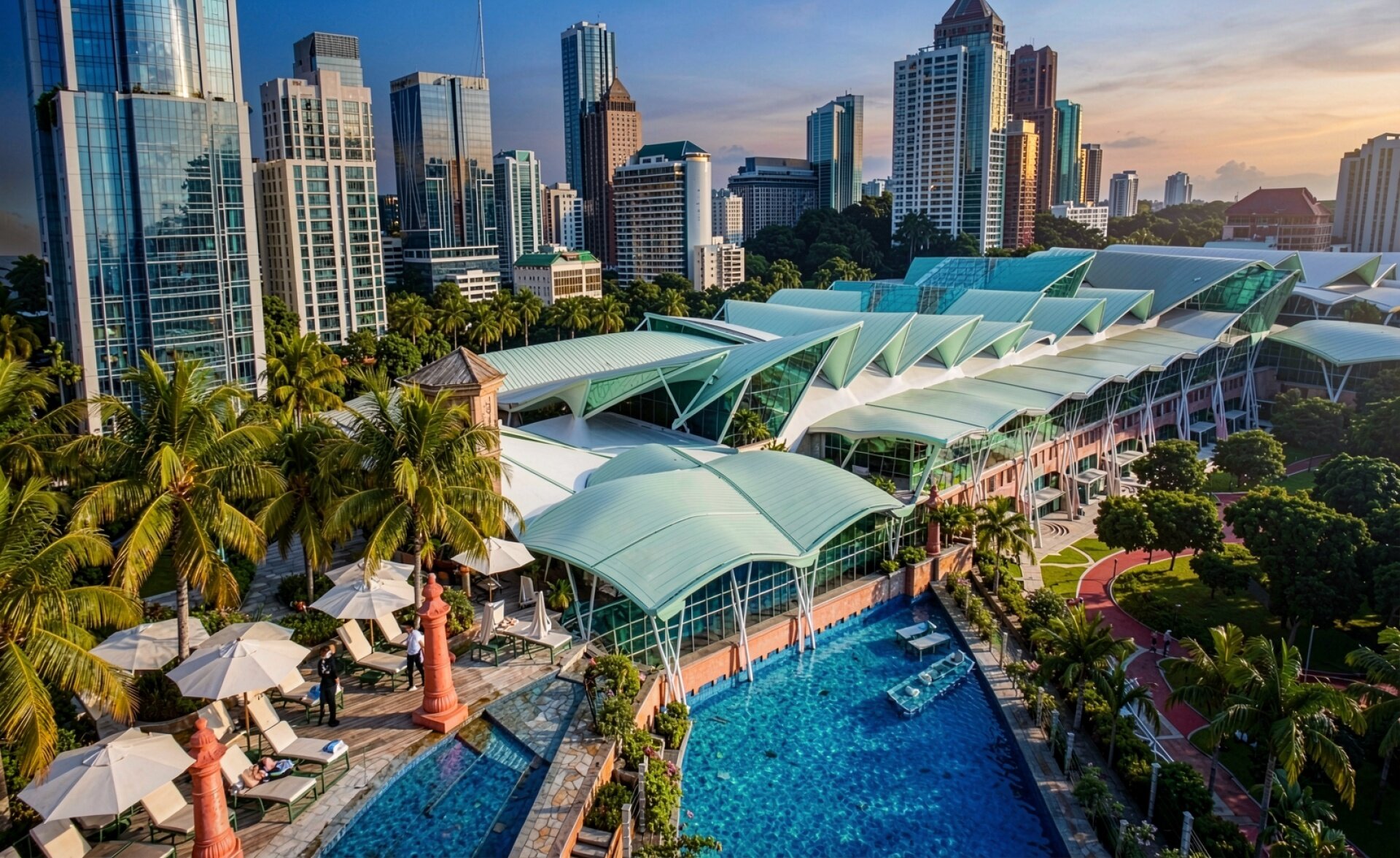 Этот снимок демонстрирует архитектурный контраст между тропической зоной отдыха и деловым центром города. Композиция объединяет ярко-голубую воду бассейна, современную стеклянную кровлю торгового комплекса и вертикали высотных зданий на фоне закатного неба.