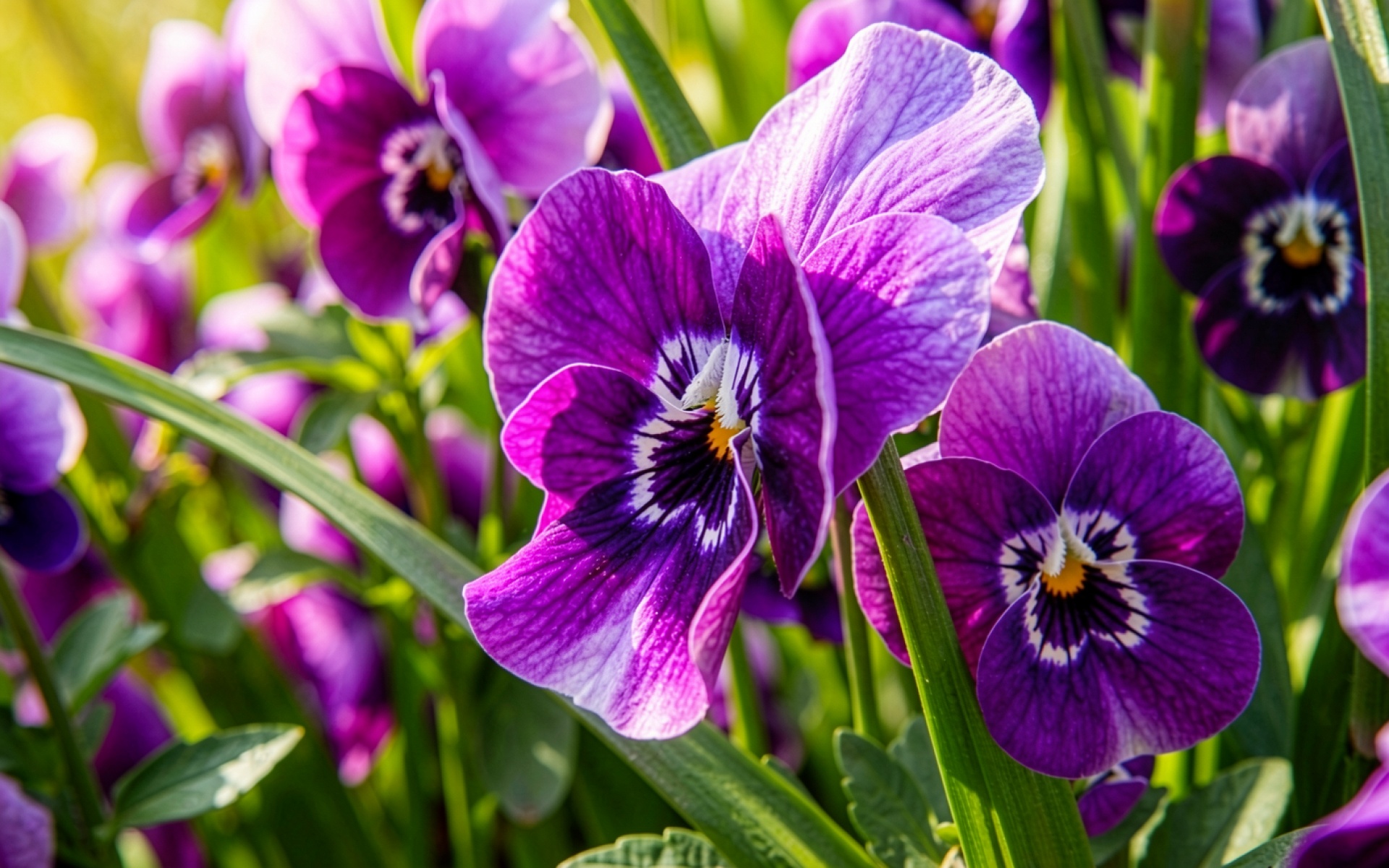 Фиолетовые цветы виолы в солнечном саду обои