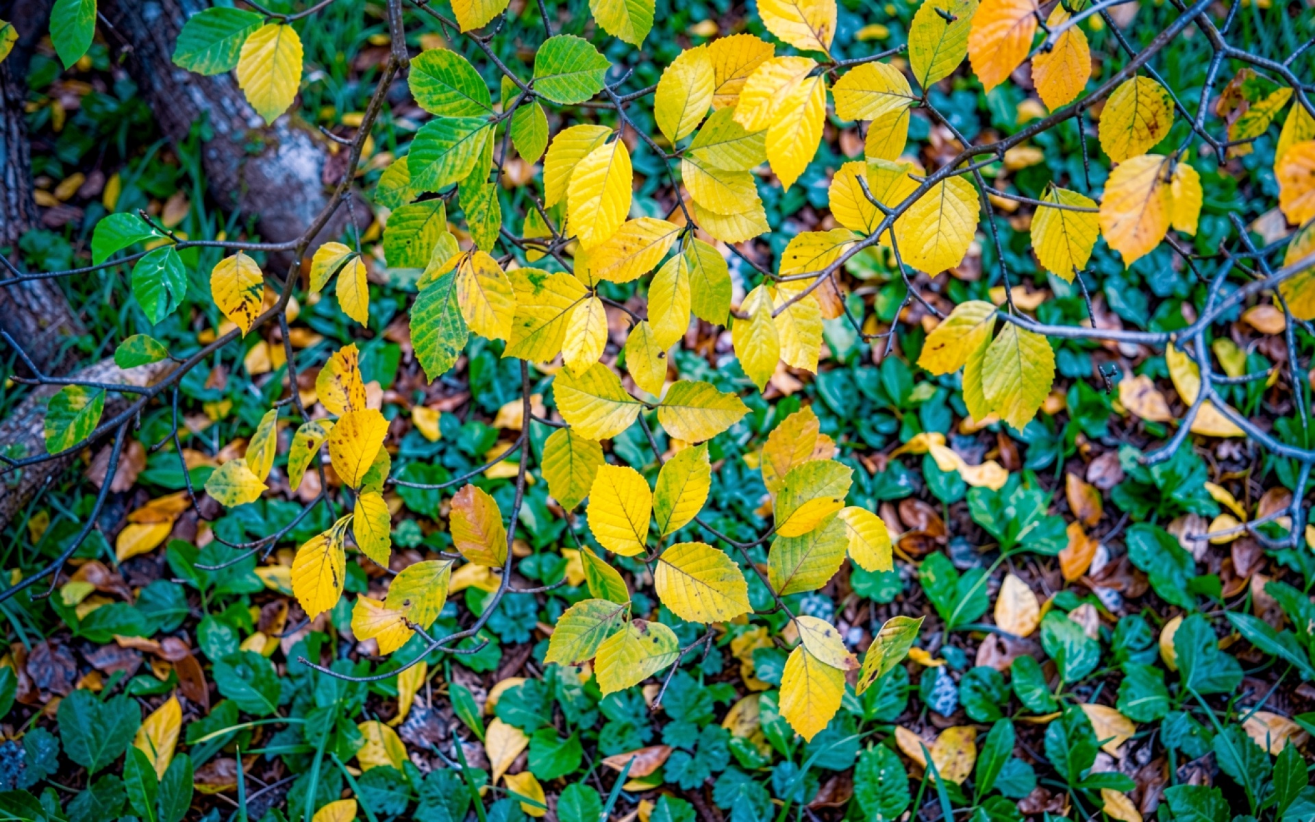 Желтые осенние листья на темном фоне обои