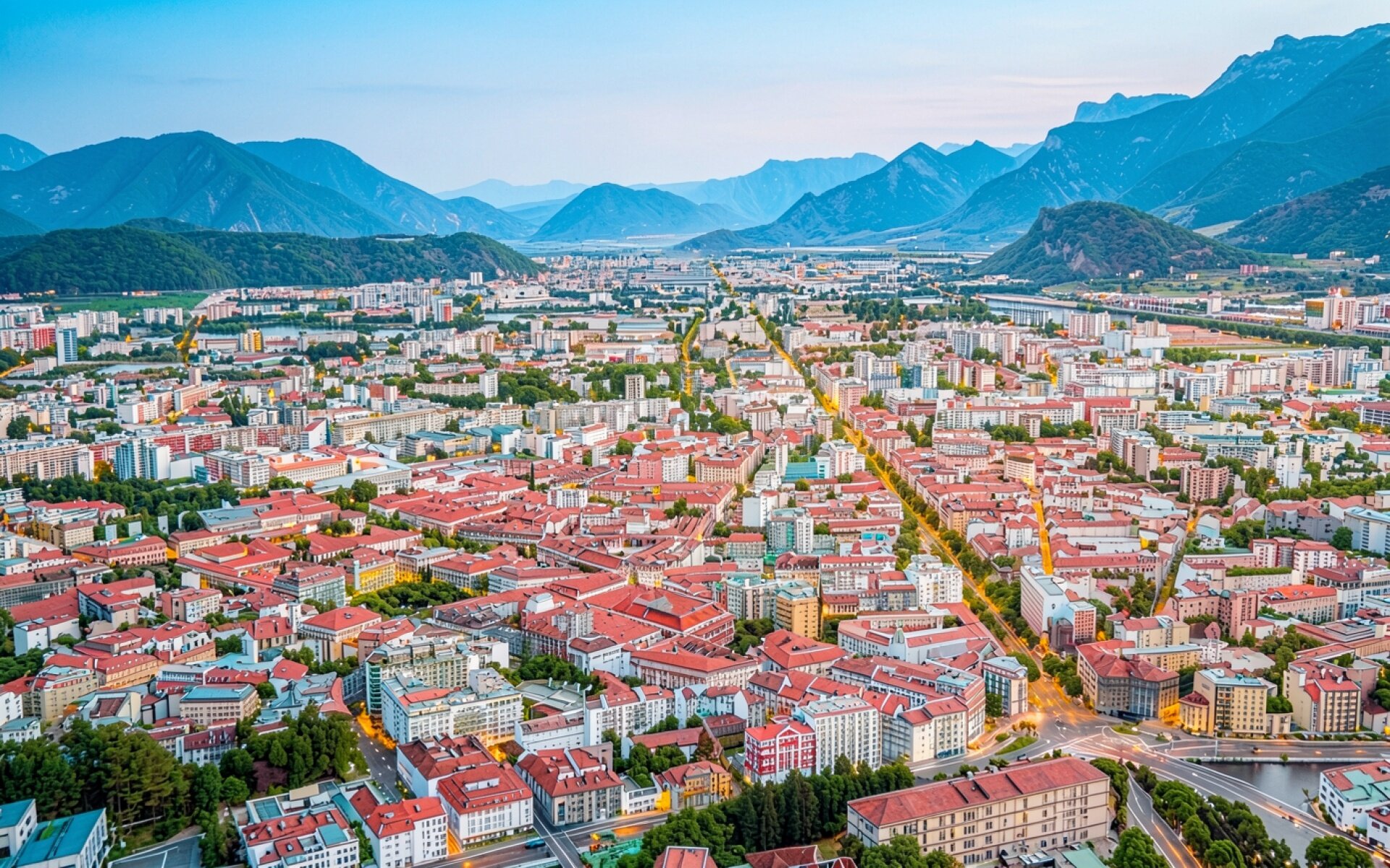 Изображение детально передает текстуру черепичных крыш и геометрию городской застройки. Освещение соответствует мягкому вечернему свету, создавая плавные градиенты на склонах гор и глубокие тени в ущельях. Контраст между терракотовыми оттенками зданий и синевой альпийских вершин подчеркивает объем пространства. На сайте предусмотрен удобный предпросмотр перед загрузкой для оценки качества на экране.