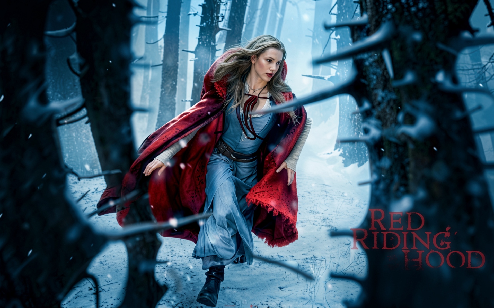 Девушка в красном плаще в зимнем лесу обои