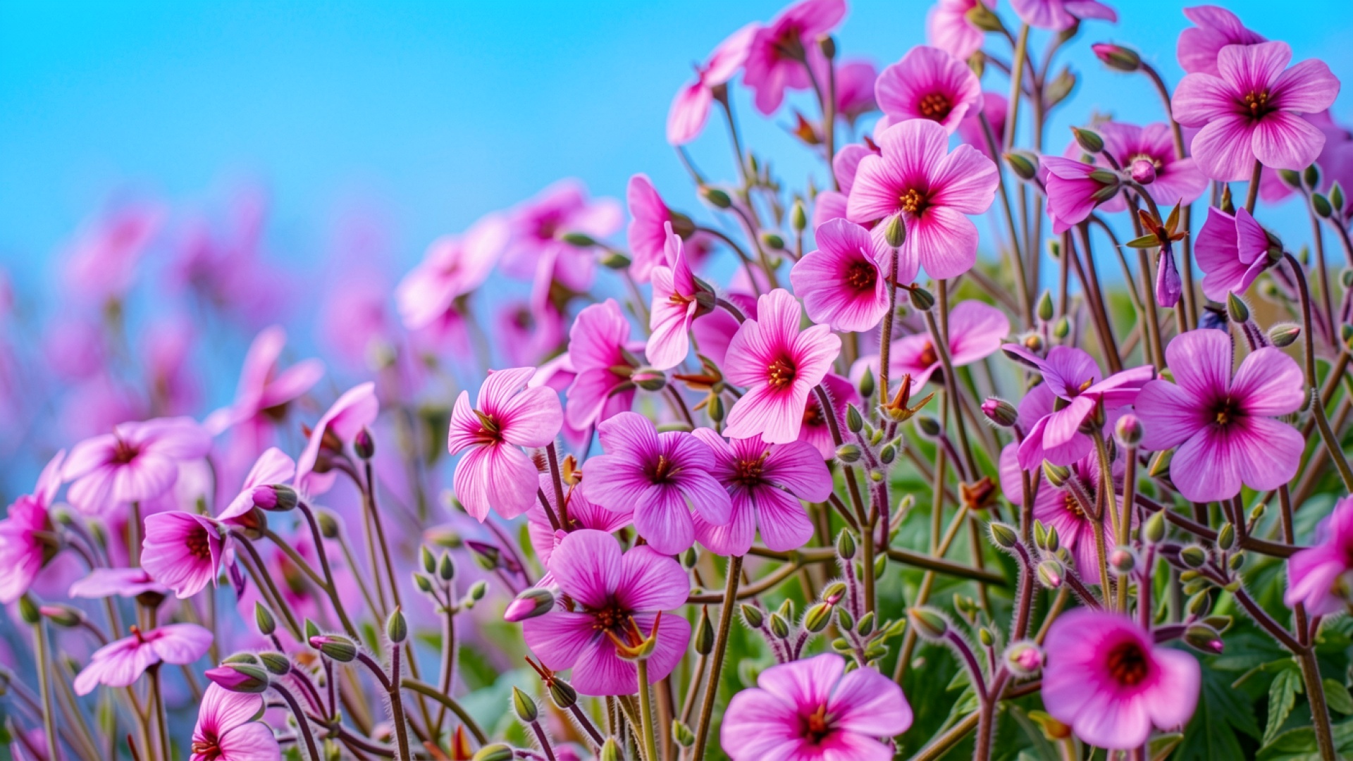 Изображение детально передает бархатистую текстуру лепестков с выраженными радиальными прожилками. Мягкое естественное освещение создает плавные переходы между насыщенным розовым центром и светлыми краями цветков, а глубокие тени в сердцевинах добавляют объему. Контрастный голубой градиент заднего плана подчеркивает четкость контуров стеблей и мелких ворсинок на бутонах. На сайте доступен удобный предпросмотр перед загрузкой для оценки качества отображения на вашем экране.