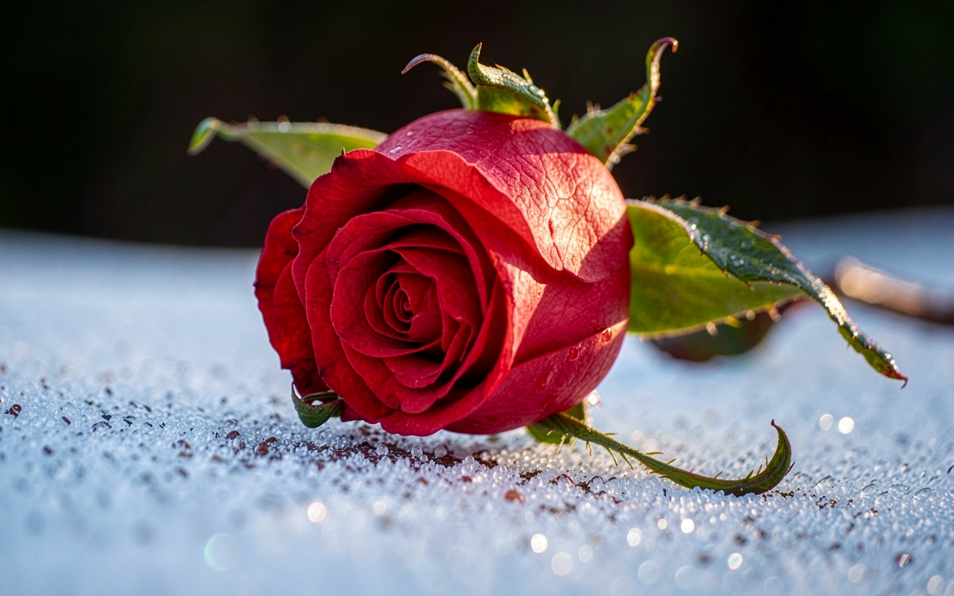 Технически изображение характеризуется высокой детализацией и правильным балансом белого, что предотвращает засветы на снегу. Глубина резкости настроена так, чтобы сфокусировать внимание на центре бутона, оставляя задний план в мягком размытии (боке). Согласно данным botanicalgarden.org, контраст цветов в природе часто служит механизмом привлечения внимания, что здесь усилено искусственно за счет освещения. Высокое разрешение файла обеспечивает четкость линий даже при масштабировании под 4K мониторы.