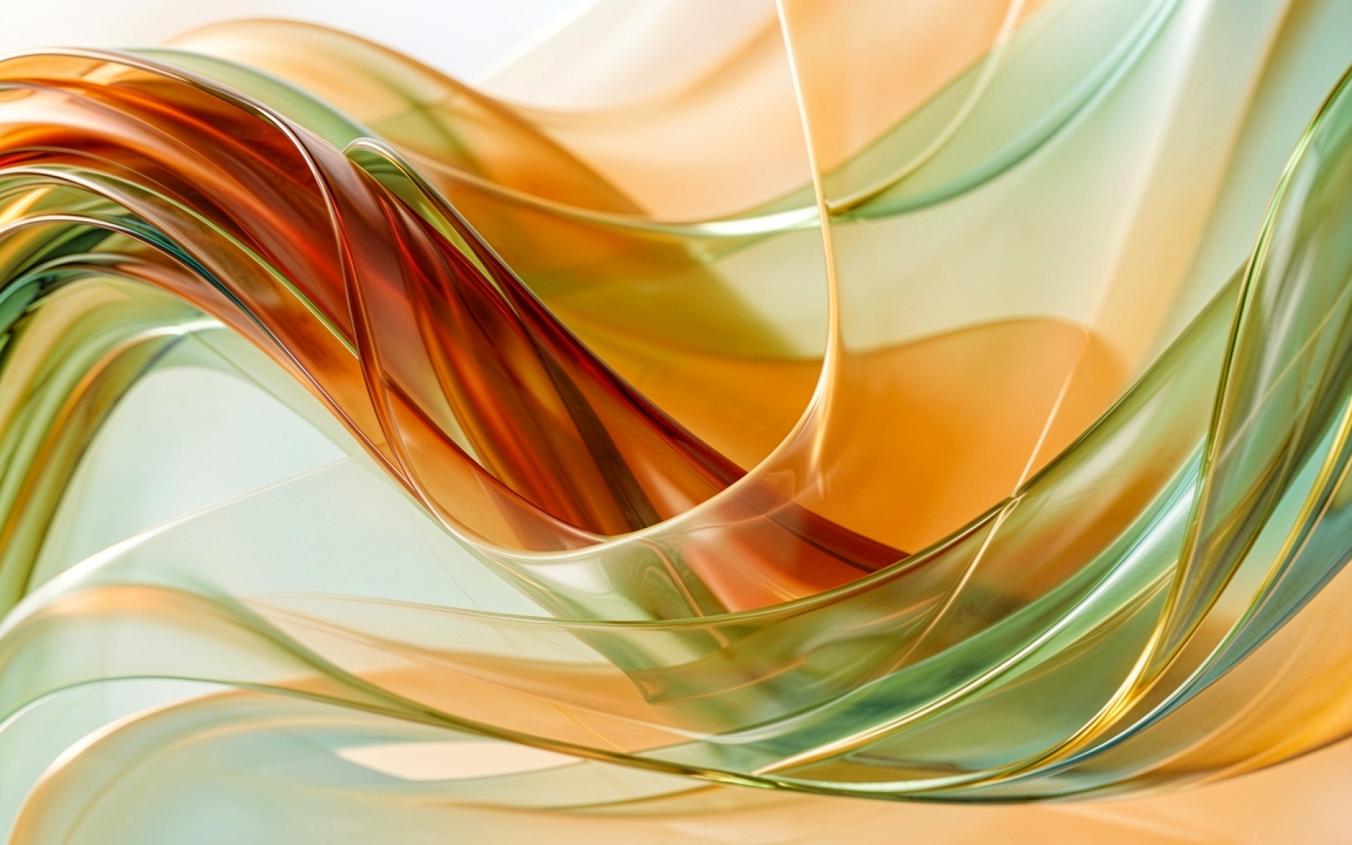 Изображение характеризуется сложной игрой света на глянцевых поверхностях и плавными градиентами между охристыми и изумрудными оттенками. Особое внимание уделено бликам на изгибах стеклянных лент, которые создают ощущение объема и глубины пространства. Мягкие тени подчеркивают многослойность композиции, а прозрачные текстуры взаимодействуют с фоновым освещением. На сайте предусмотрен удобный предпросмотр перед скачиванием для оценки качества отображения на вашем экране.